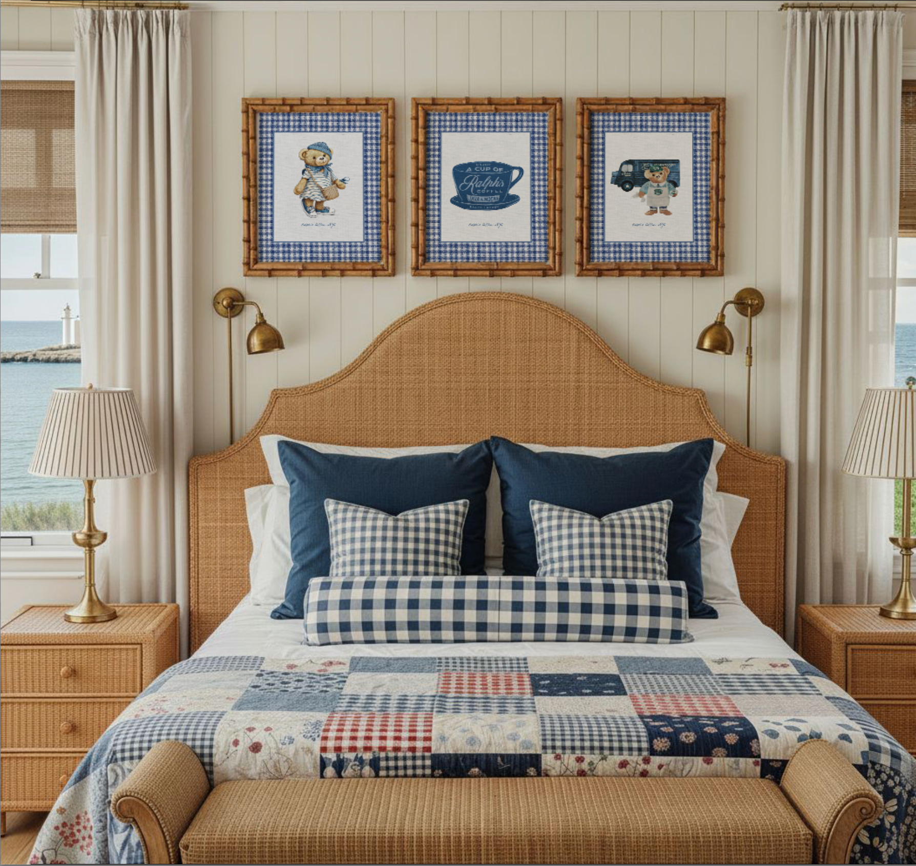 Gallery Set of 3 Ralph's Coffee Prints Denim Blue Artwork on Gingham Background Whimsical Bear Illustration