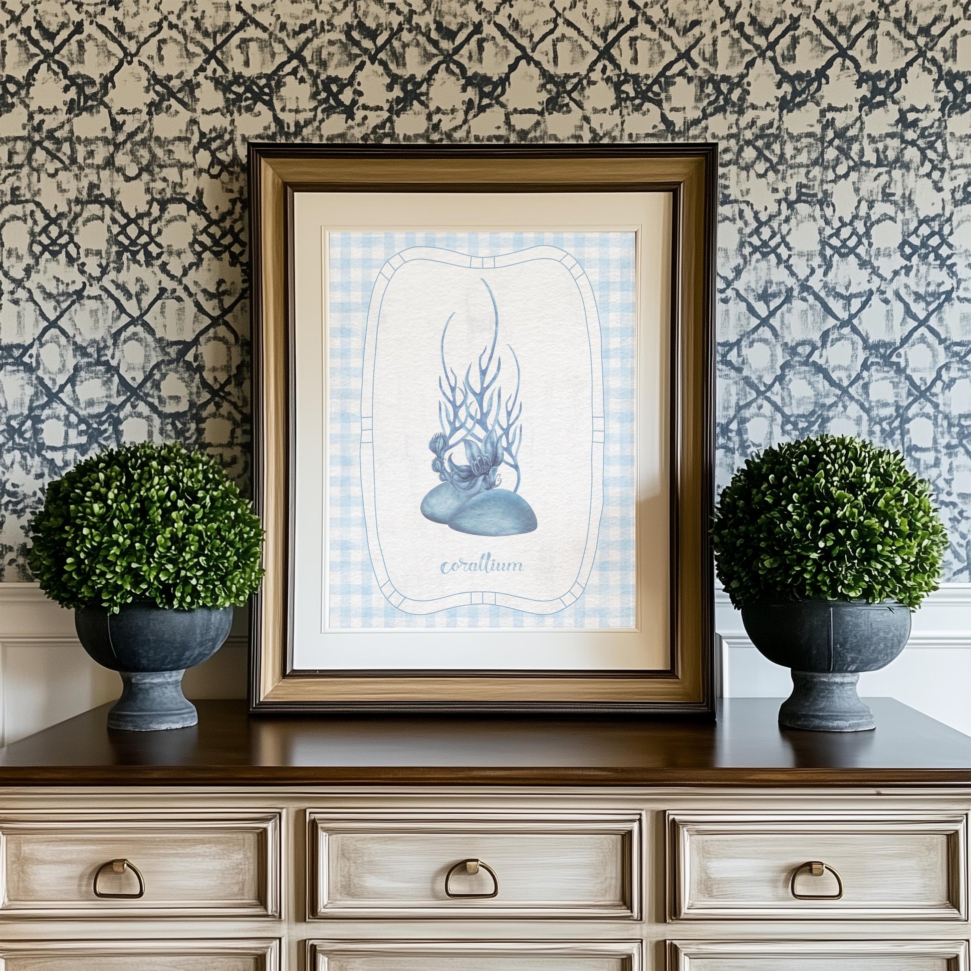 Beach House Coral Wall Art on Gingham Background in Sea Blue