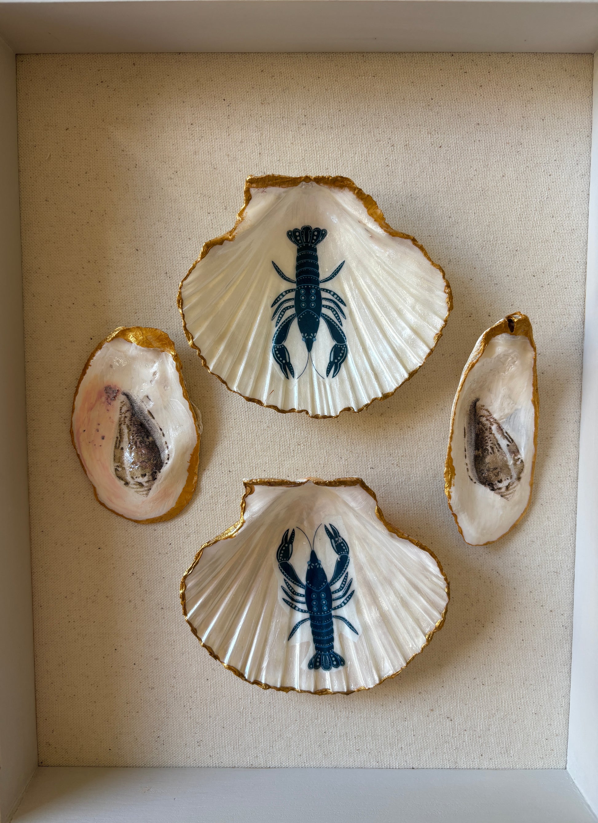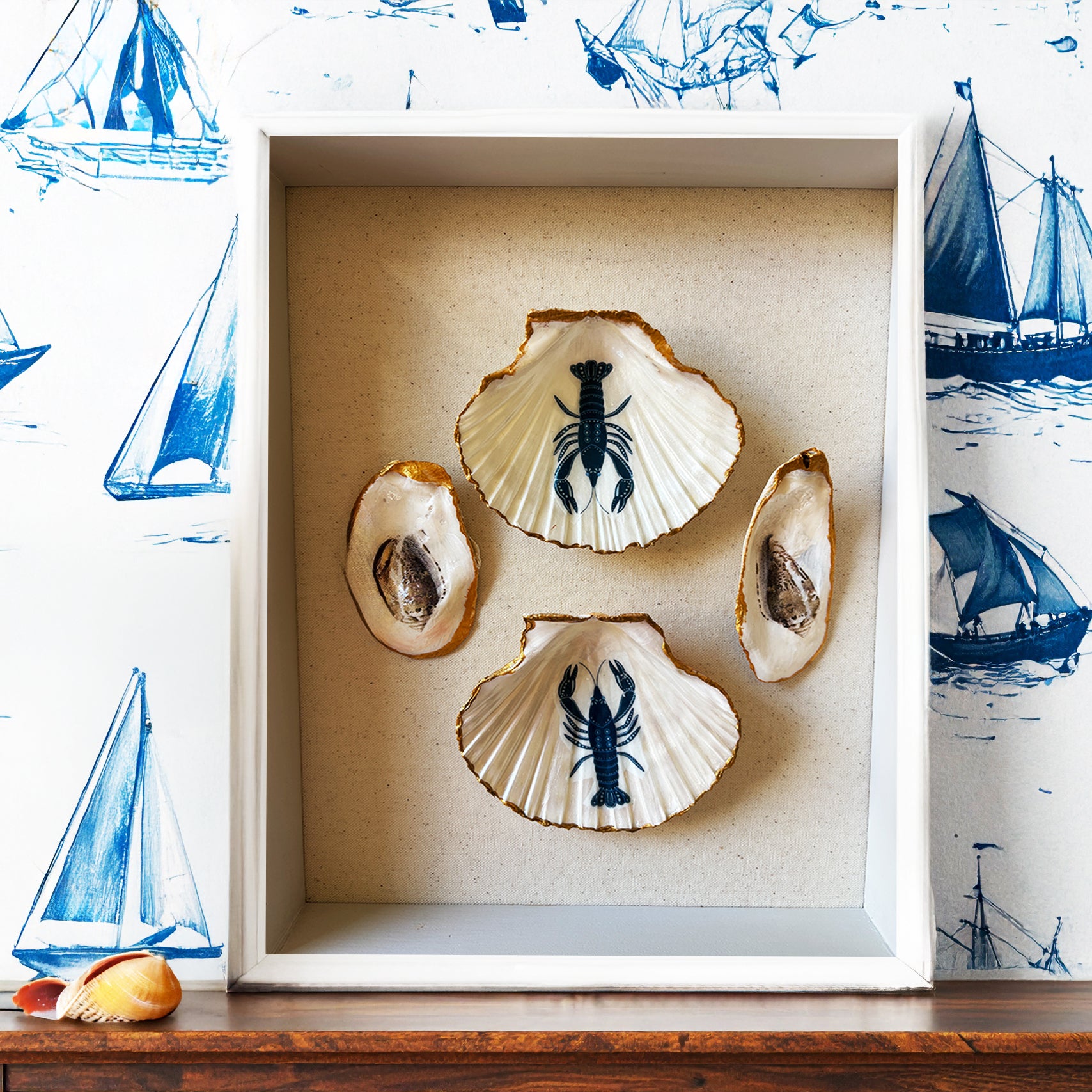 Decoupage selection of assorted navy blue lobster and natural seashells with gold leaf edges, arranged on natural linen canvas. The deep custom frame is made of white solid wood, features a magnetic door and a polished glass window.