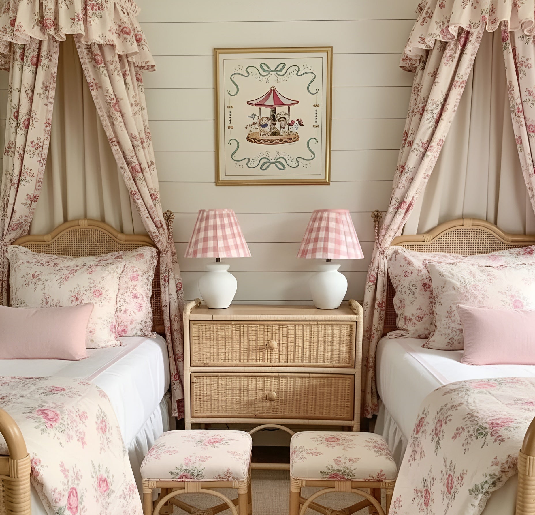 Capture the magic of childhood nostalgia with this pastel rendering of an old fashioned french carousel placed inside a whimsical floral border.