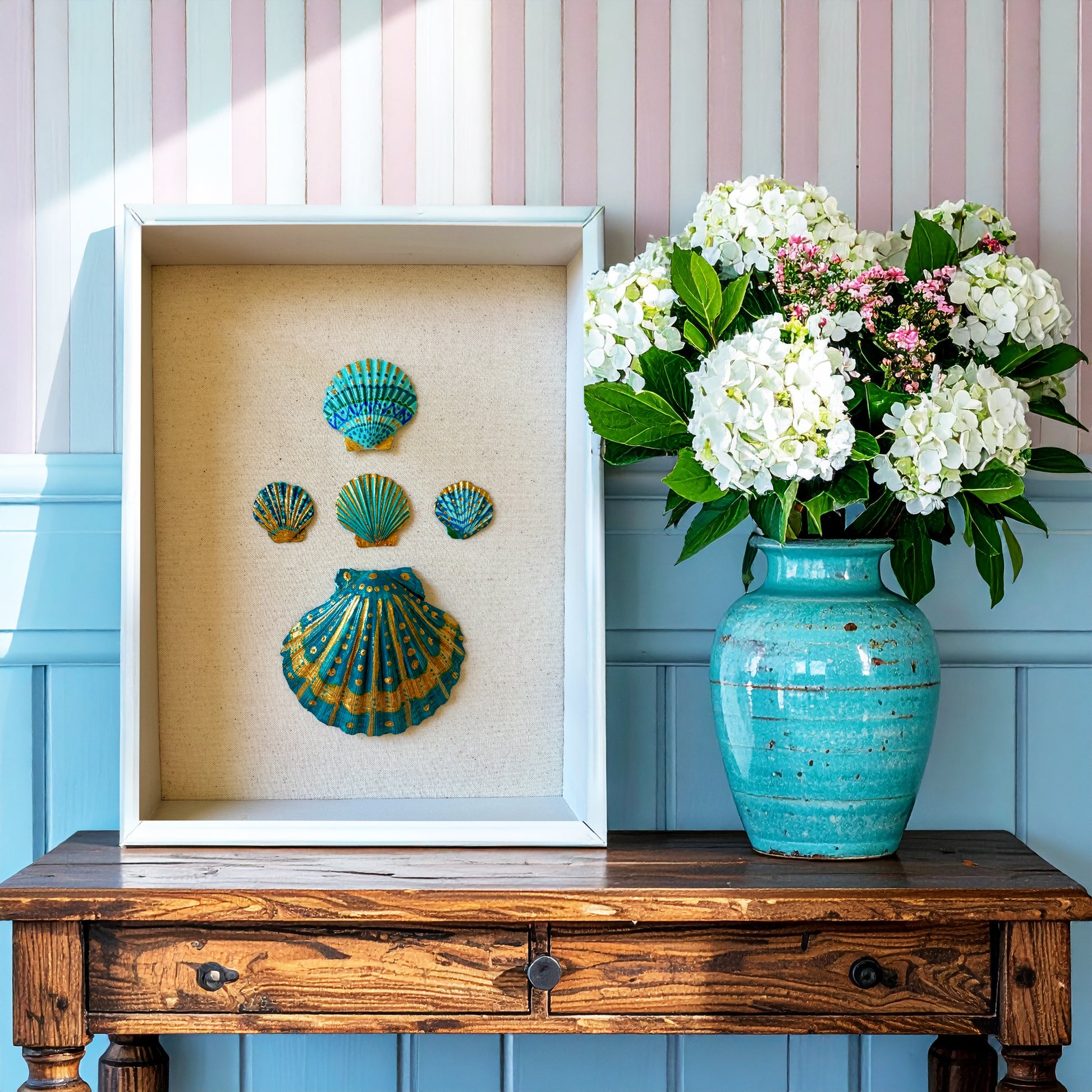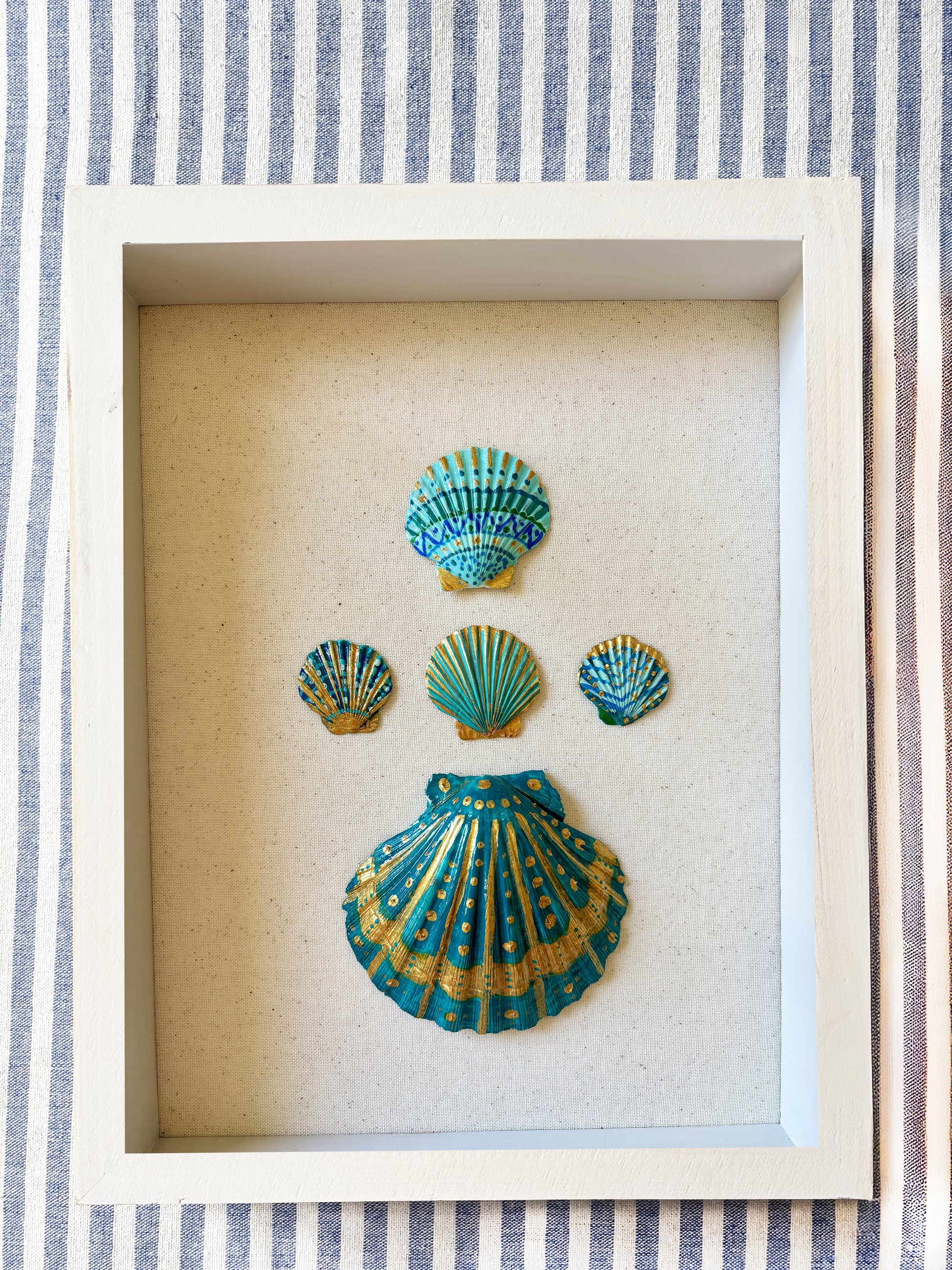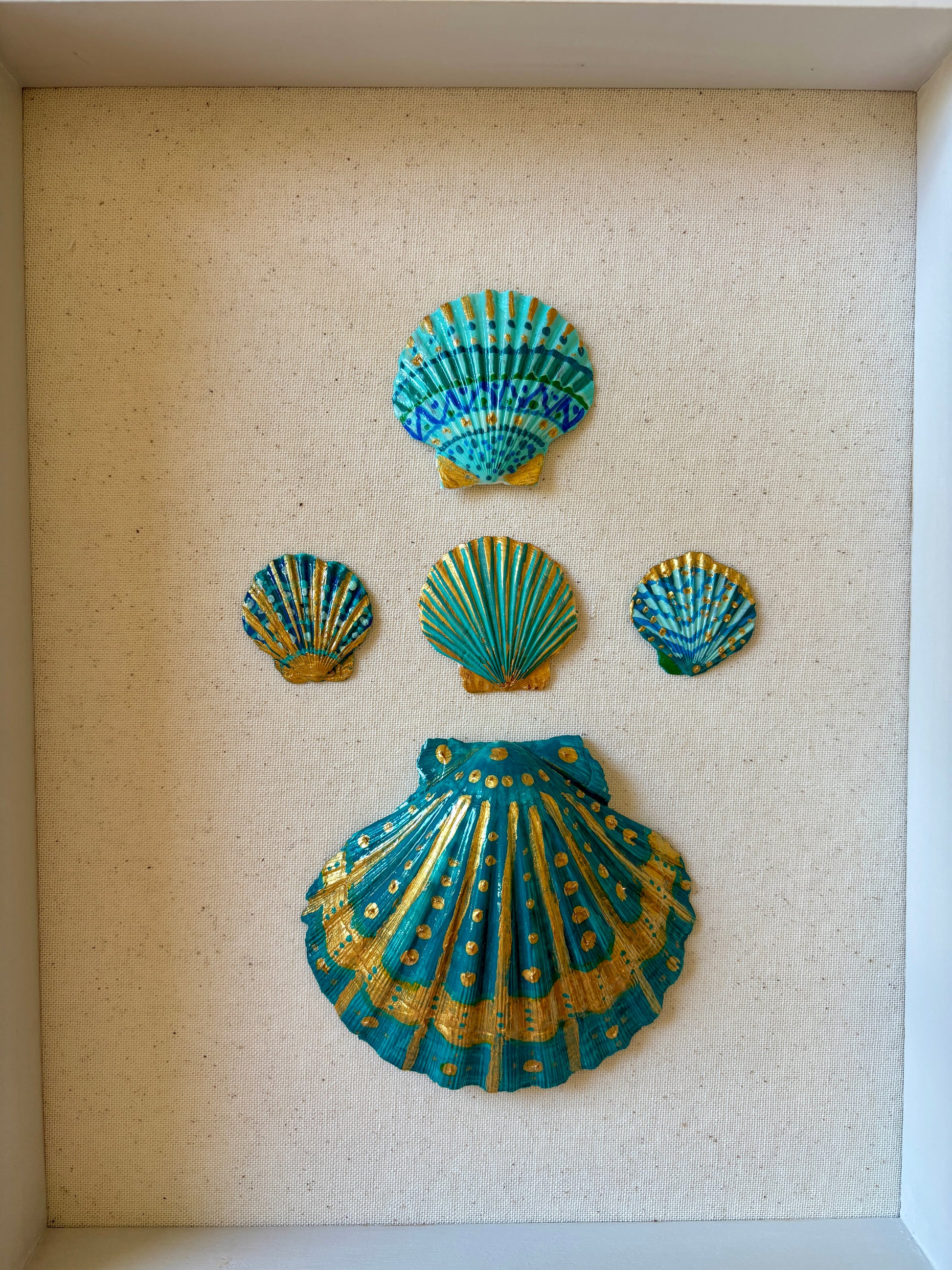 Hand painted selection of assorted blue, green and turquoise seashells with gold leaf edges, arranged on natural linen canvas. The deep custom frame is made of white solid wood, features a magnetic door and a polished glass window.