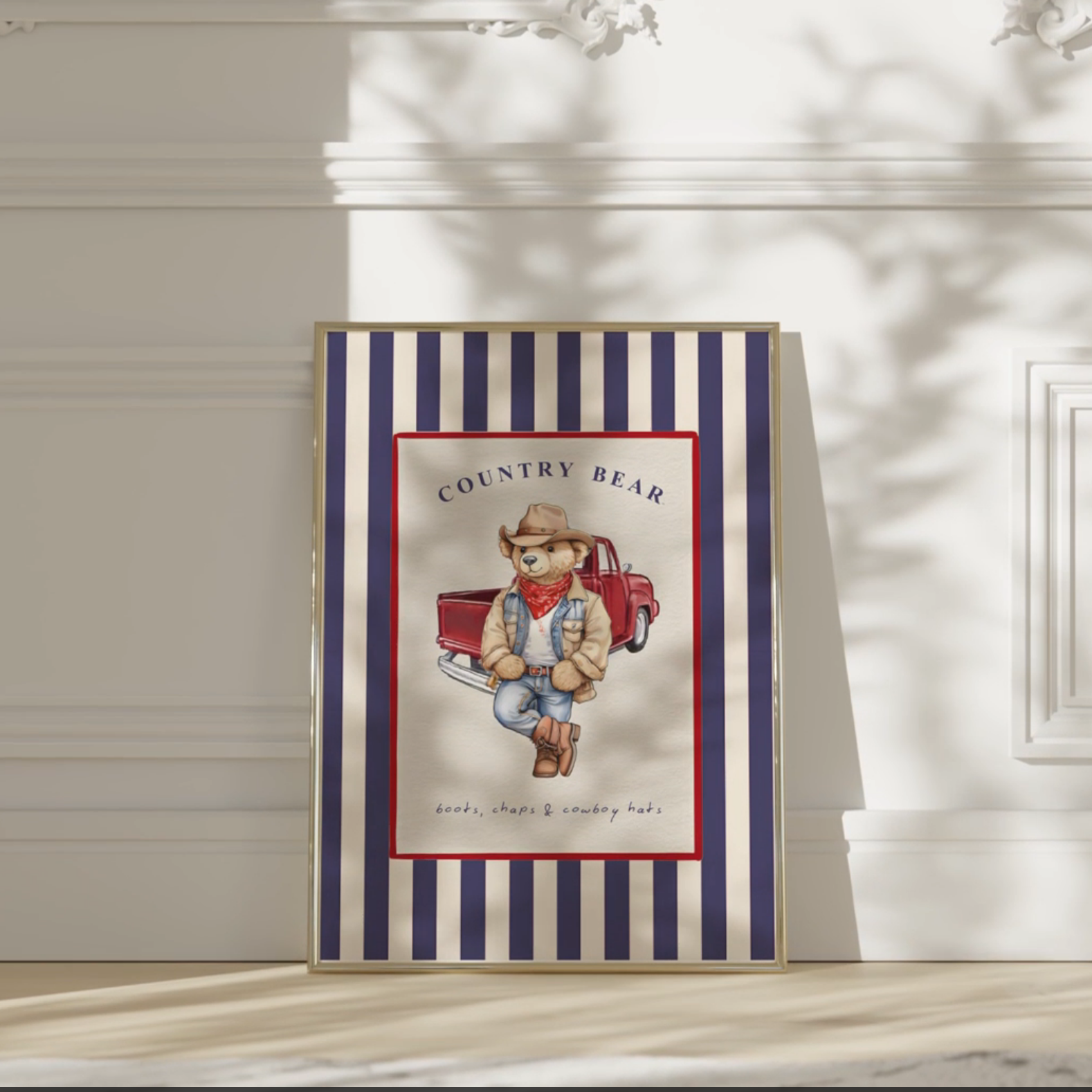 Warm up your home with the charm of this ever popular Country Bear drawing with a blue and off white striped background, featuring our favorite bear in cowboy boots and vintage denim jeans in front of his red truck. The wording "Country Bear" and "boots, chaps & cowboy hats" complete this sweet contemporary and modern take on our best-loved teddy bear.