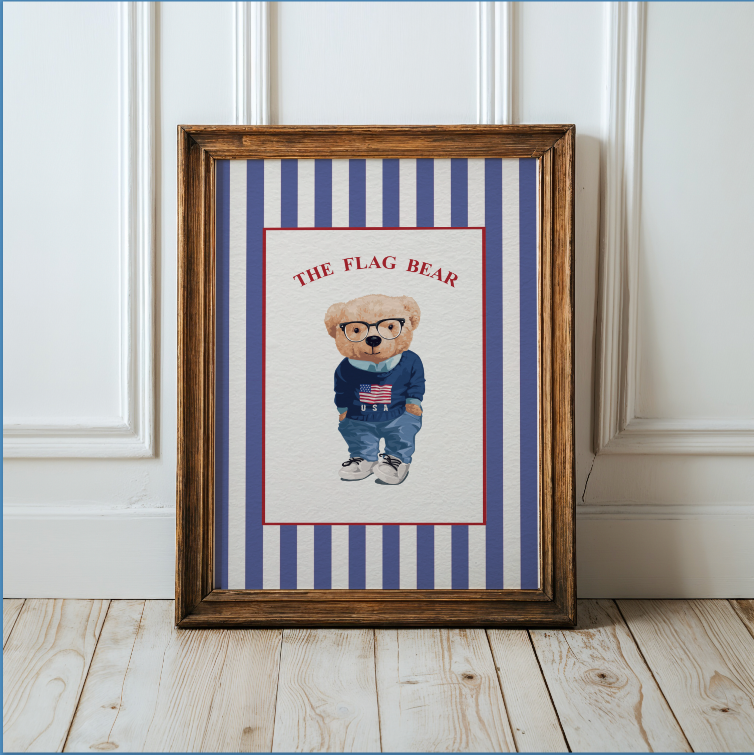 Vintage Flag Bear Wall Art, Watercolor Preppy Teddy Bear Illustration