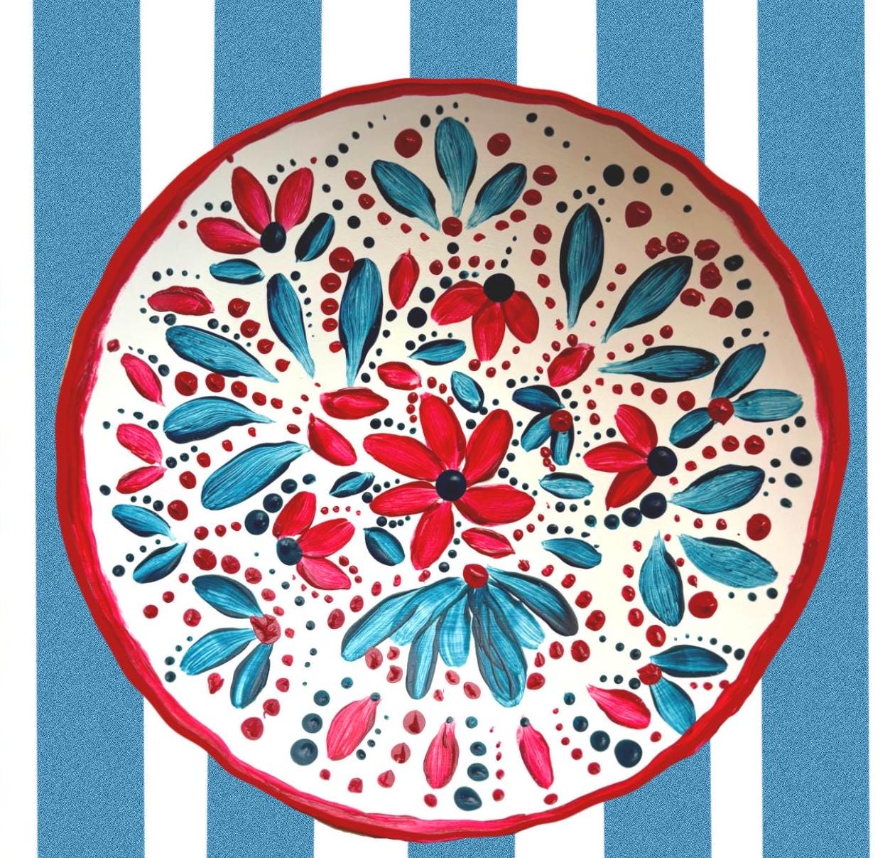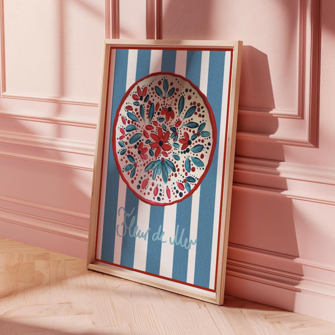 Modern Floral Wall Art Colorful Blue And White Striped Artwork