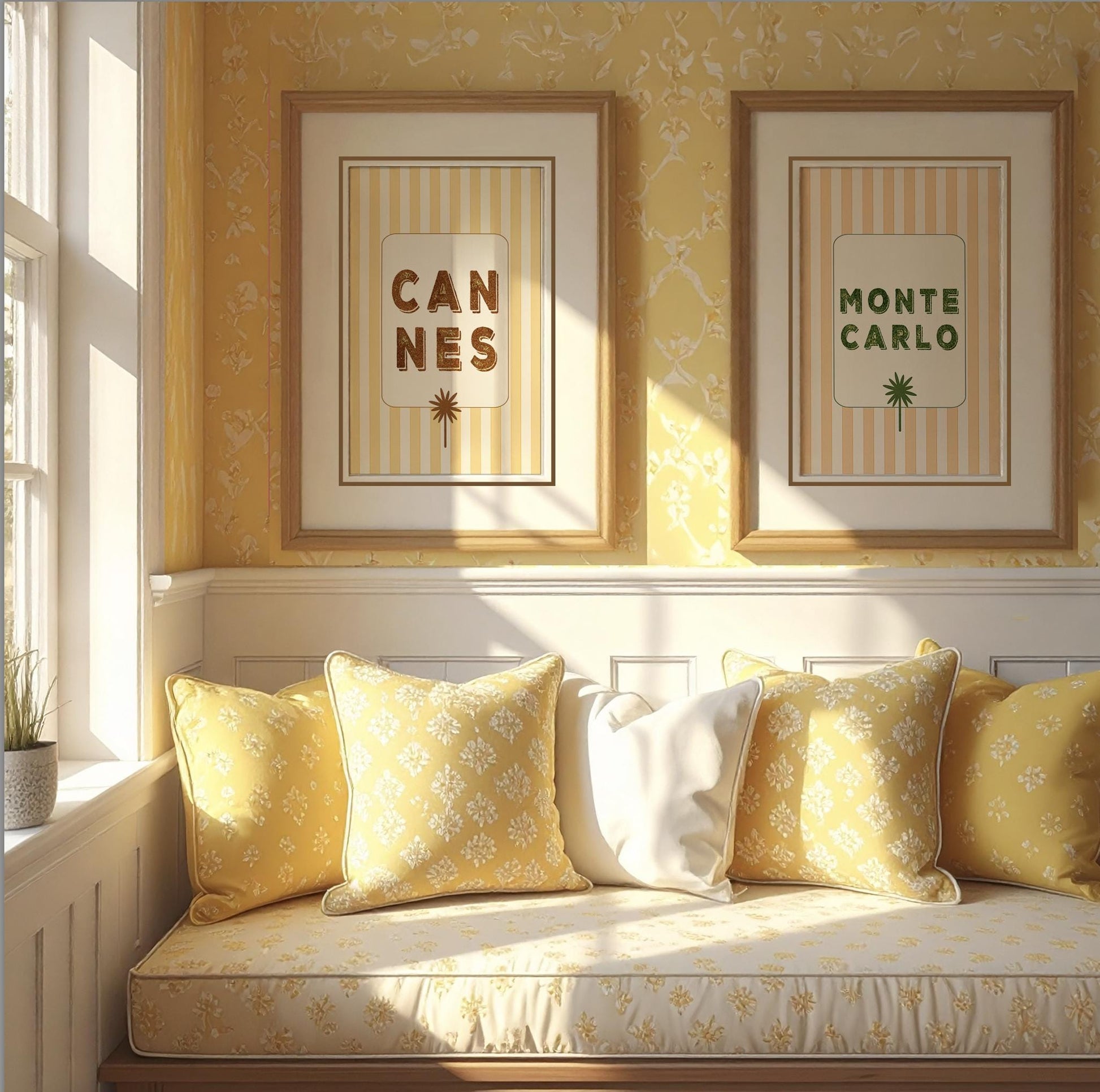 ☀️ My contemporary take of a classic vacation destination print. The Monte Carlo illustration is set on a buttery yellow striped background and features a greenish blue vintage lettering and palm tree. I call it preppy coastal contemporary chic!