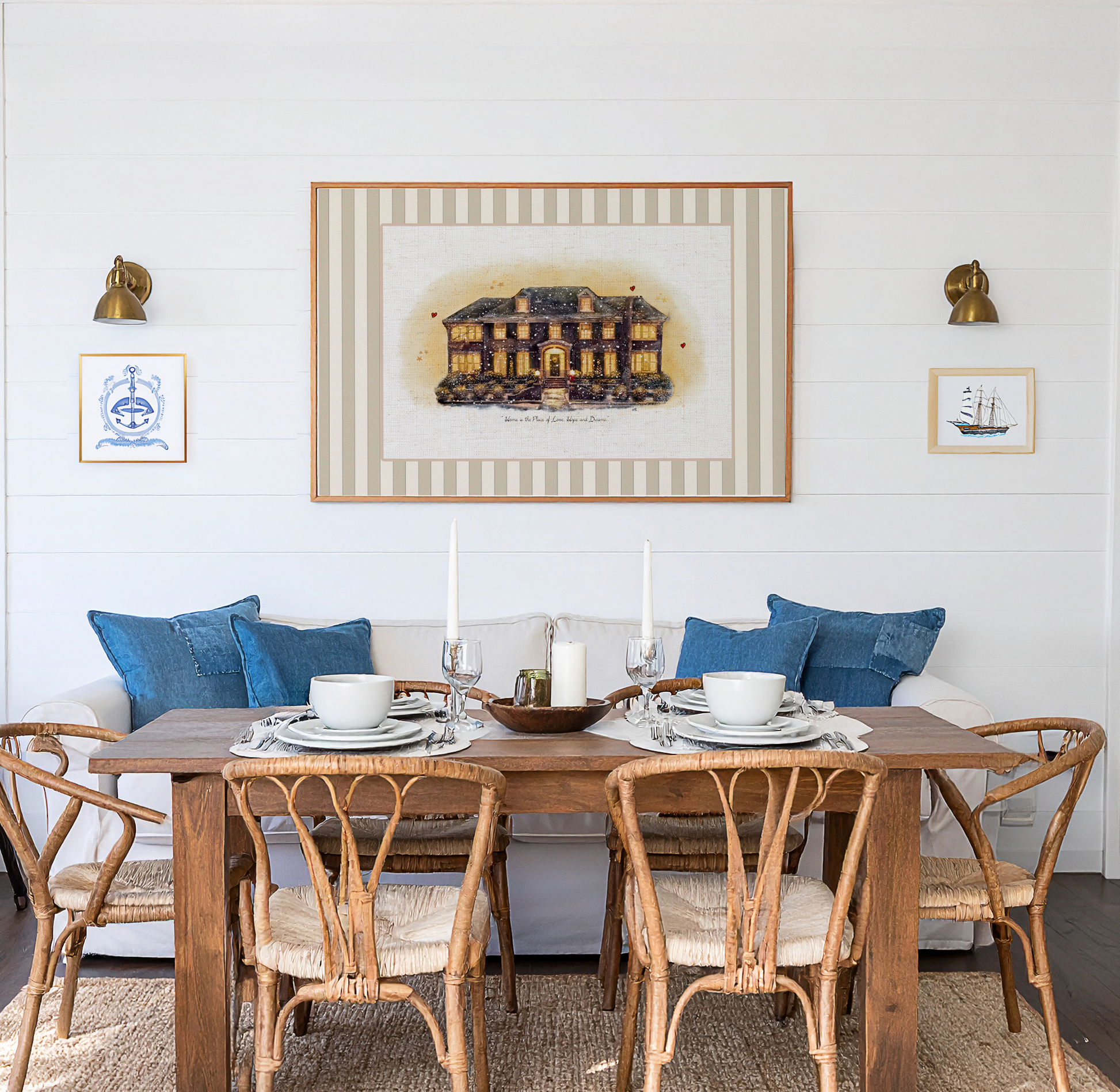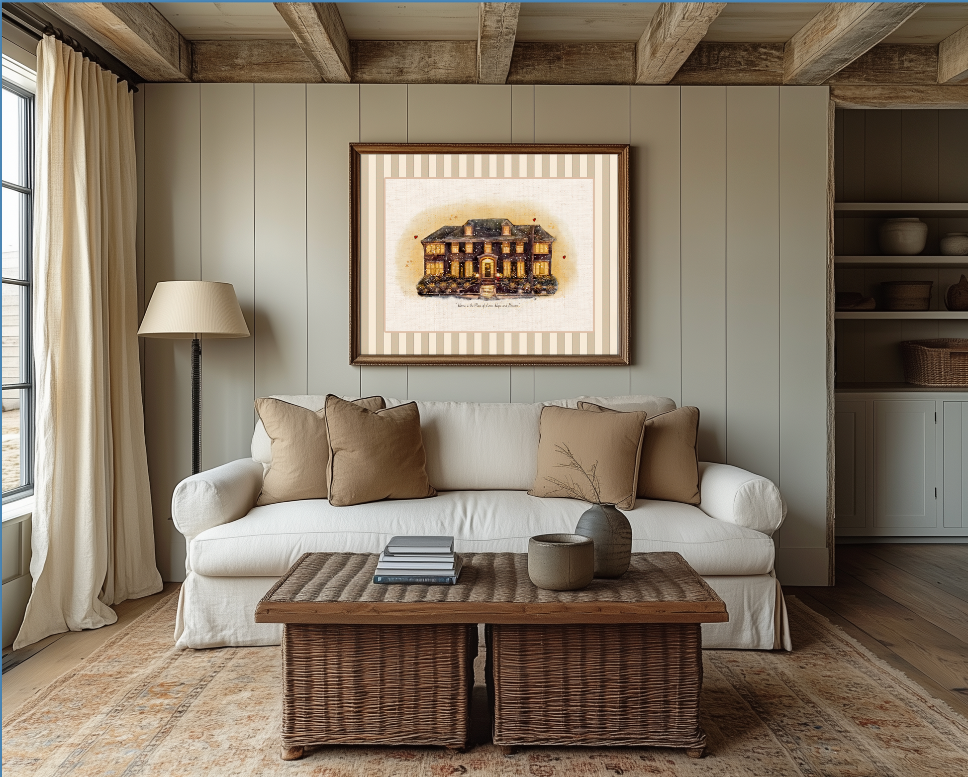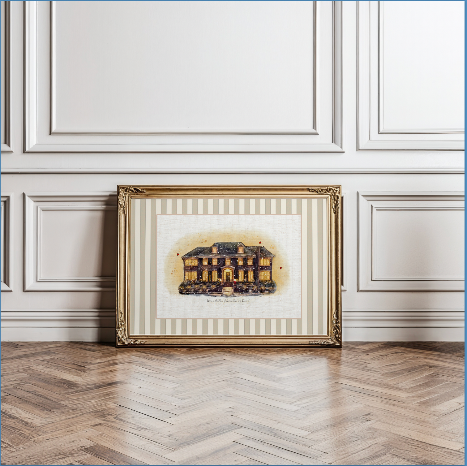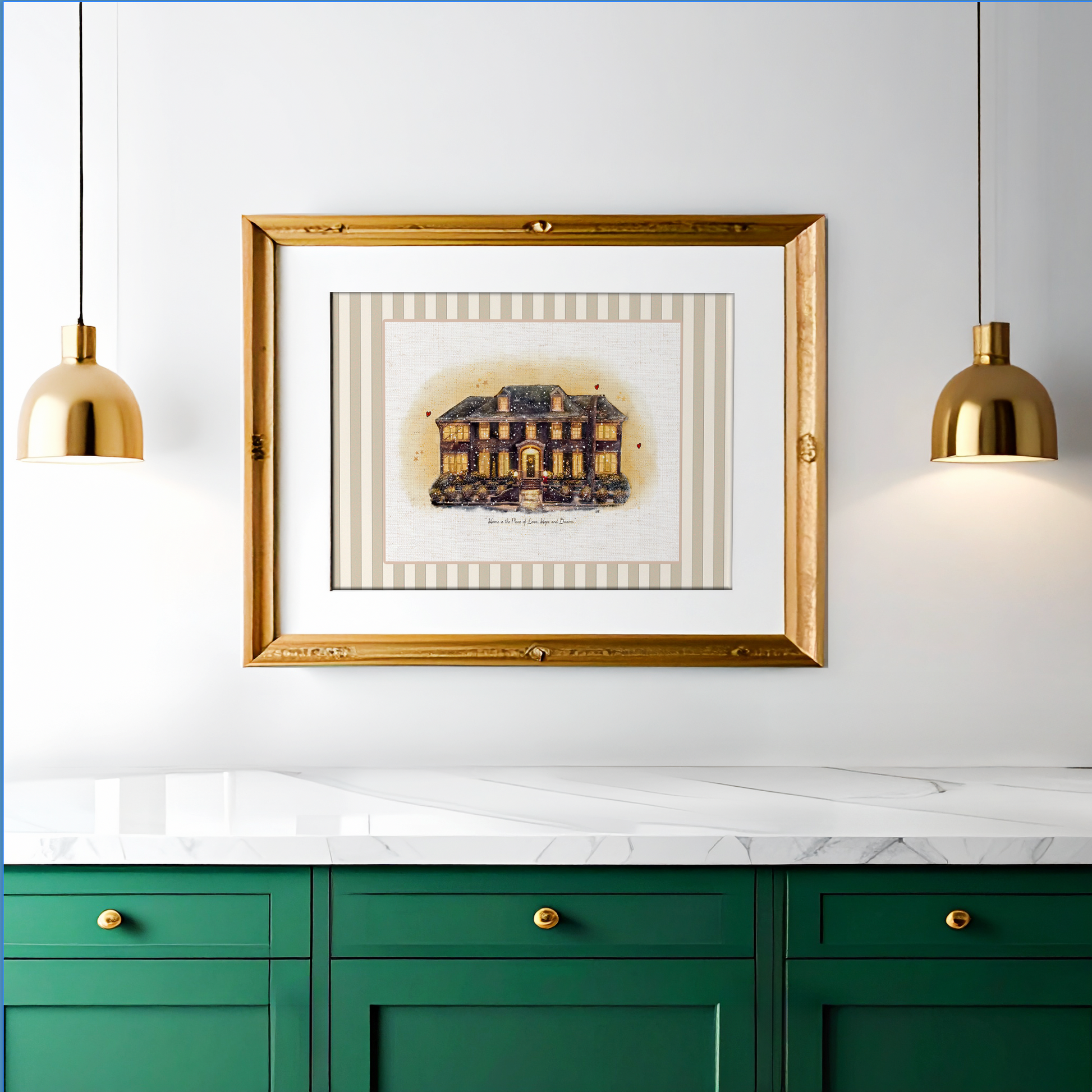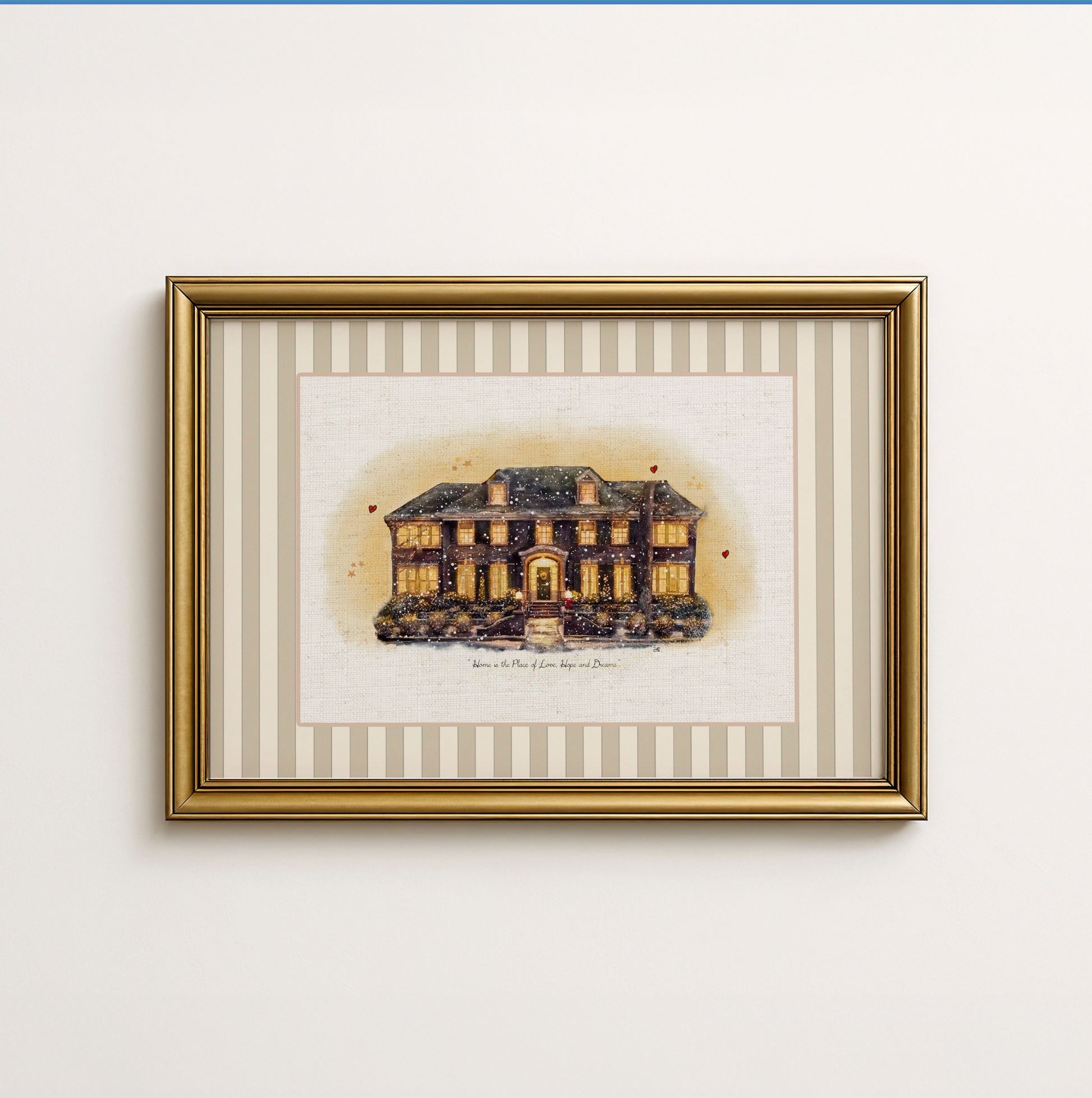 This print is taken from my original illustration of the charming and romantic home of Kevin's family, full of beautiful architectural details, warmth and festive spirit! It features a neutral colored striped background.