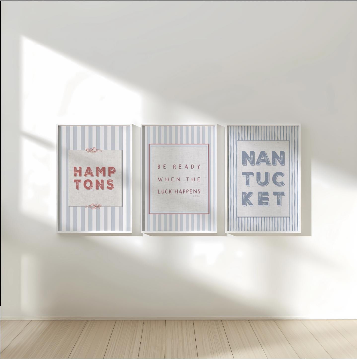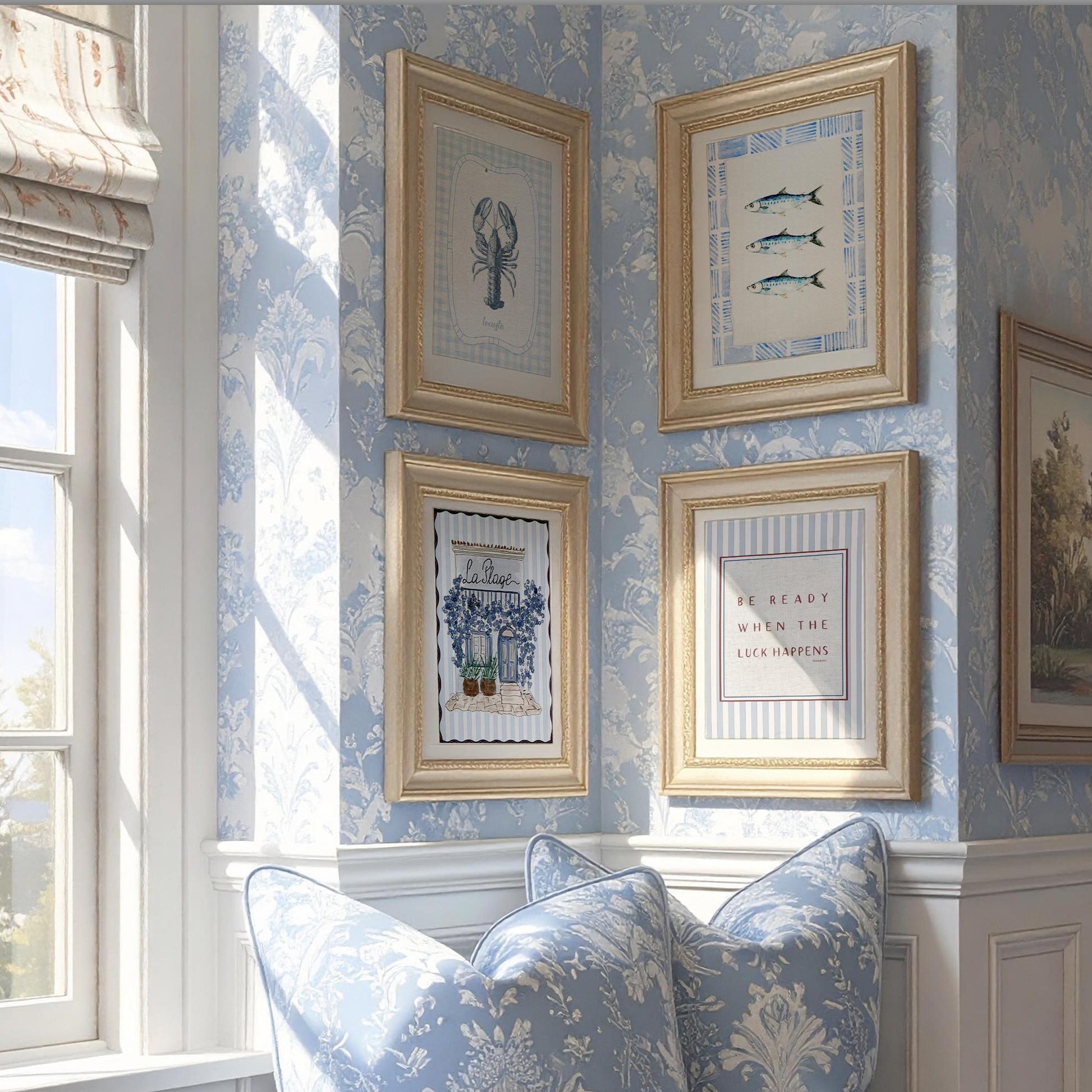 Illustrated on a textile style background and set on a light blue and white striped wallpaper.