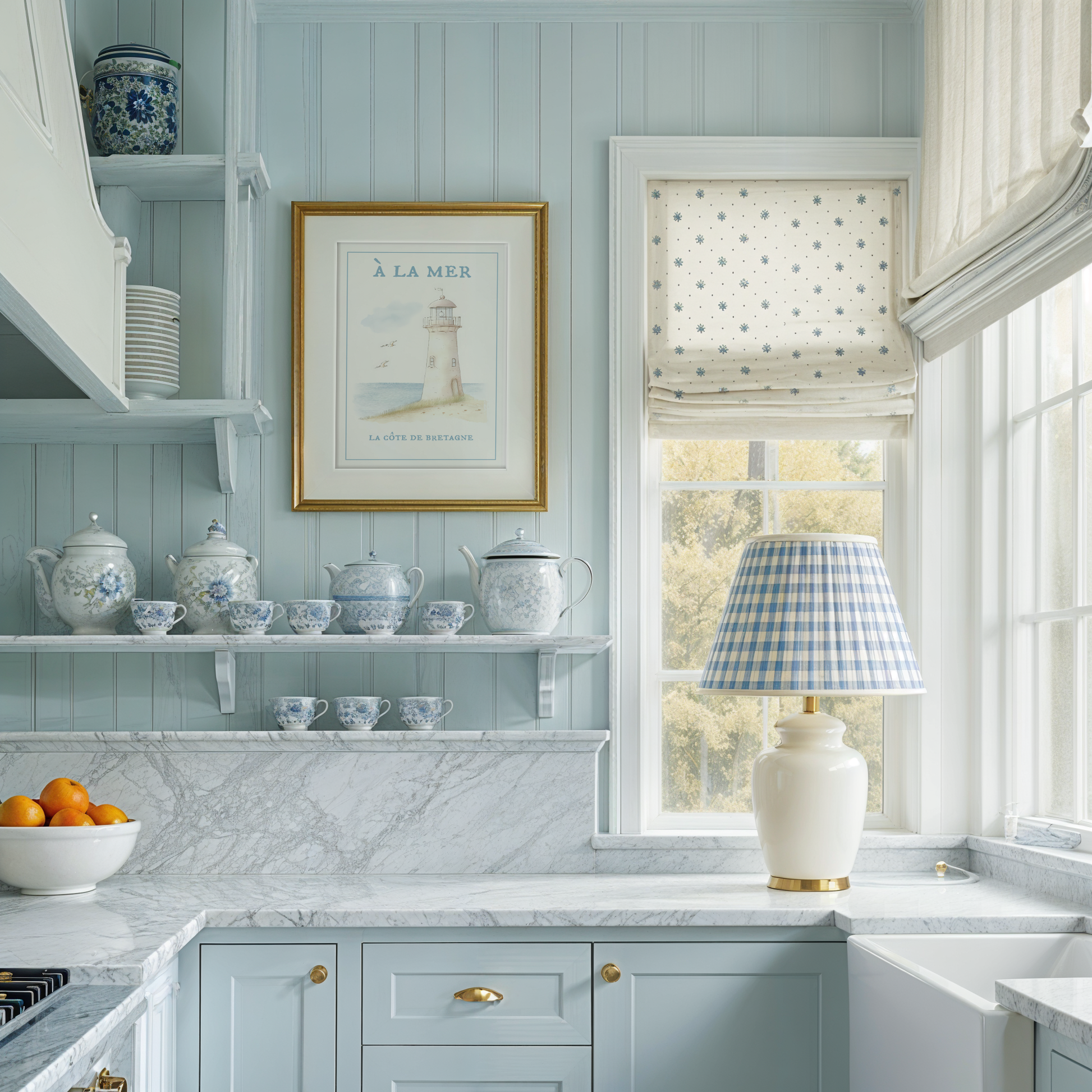 Beach House Coral Wall Art on Gingham Background in Sea Blue