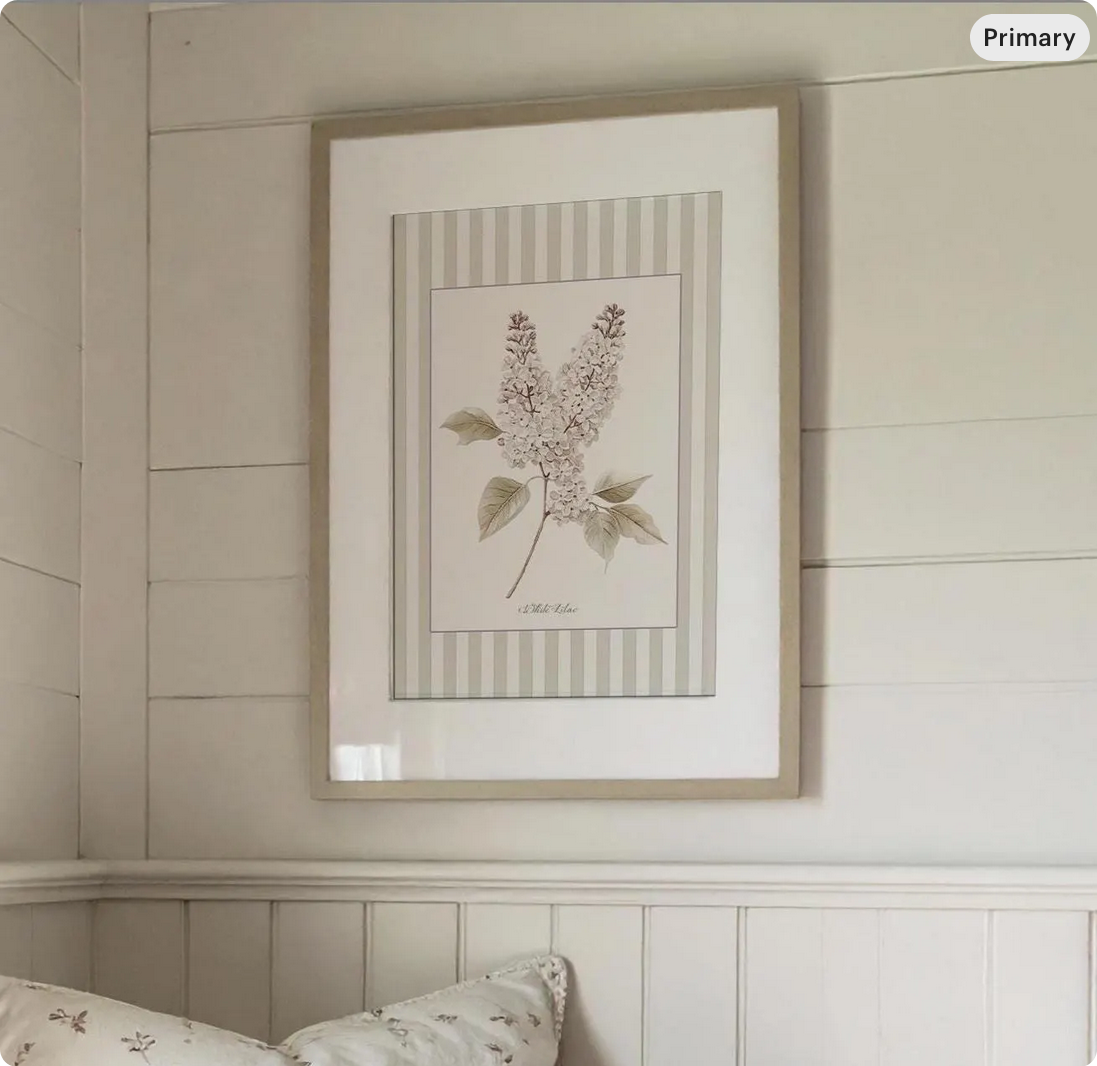 Vintage style watercolor giclee print of "la rose lilas blanche", on a sage green and off white striped background by UK/Austrian artist Daniela Spivey.
