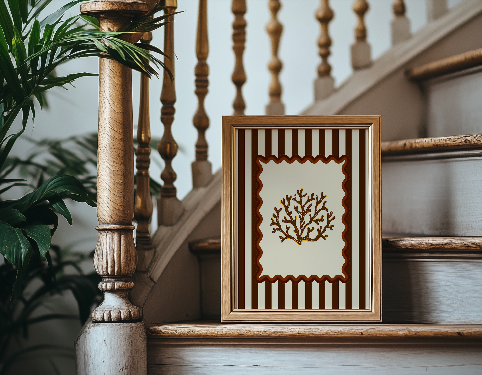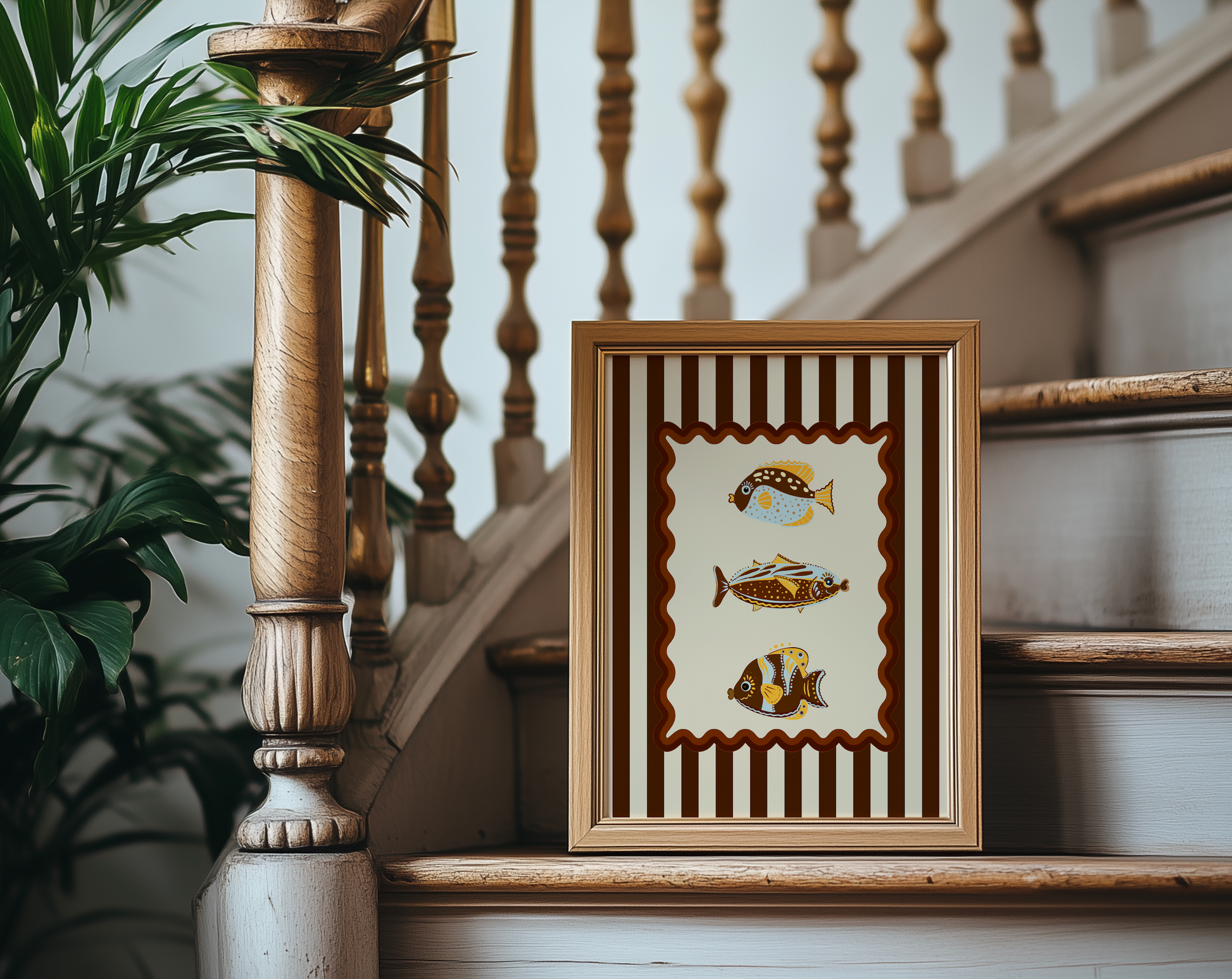 Giclee print of a coral, lobster and three fishes, each illustrated on a chocolate brown and sandy striped background by UK/Austrian artist Daniela Spivey.