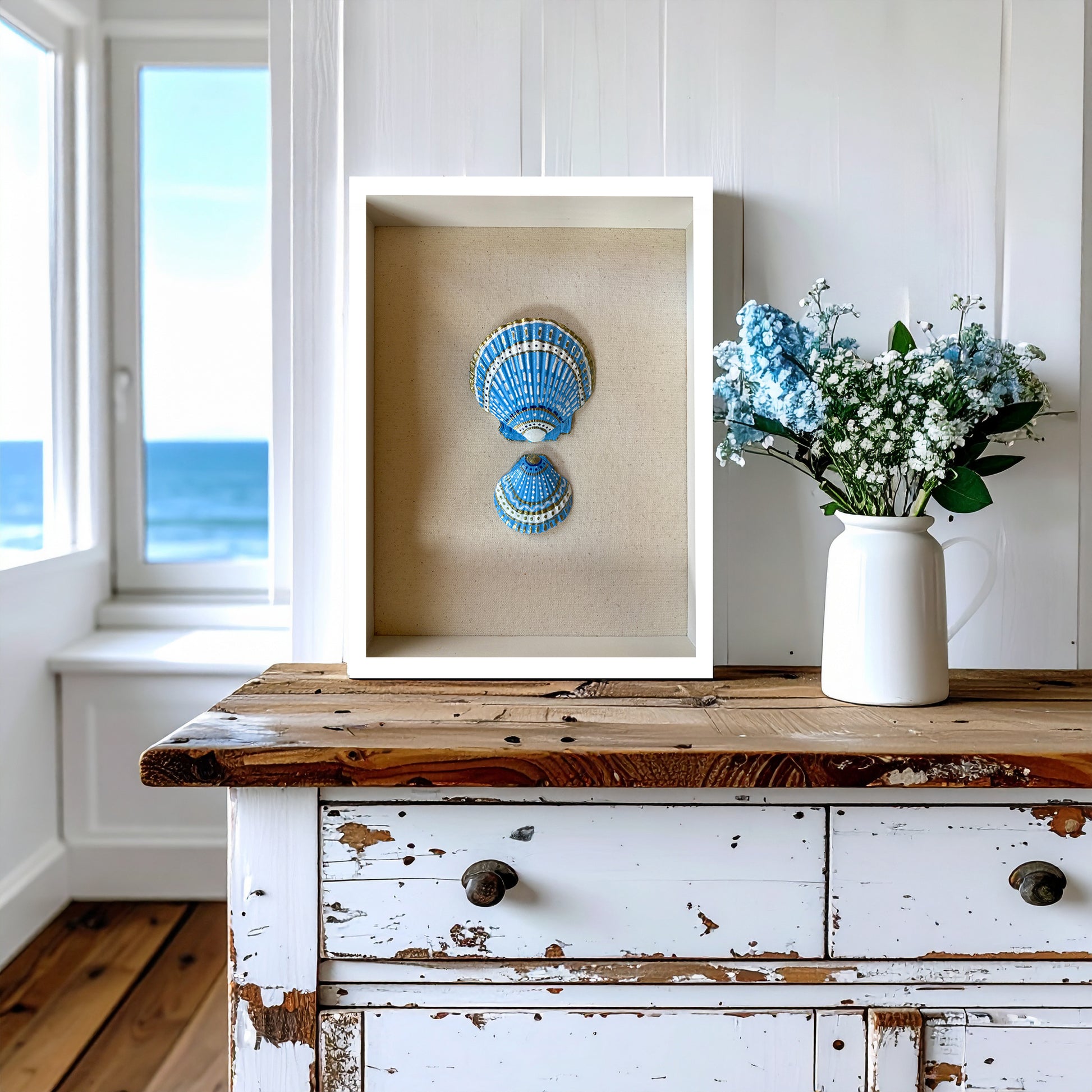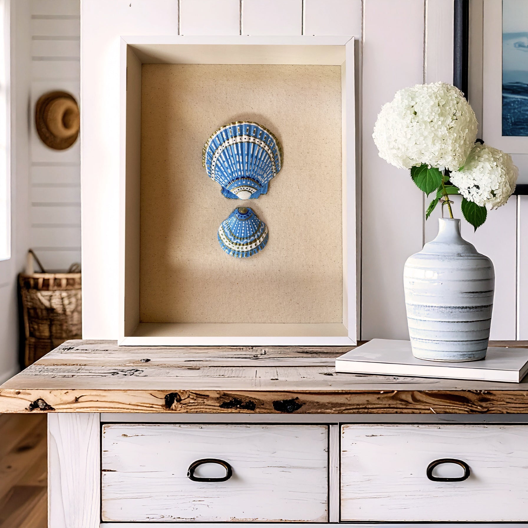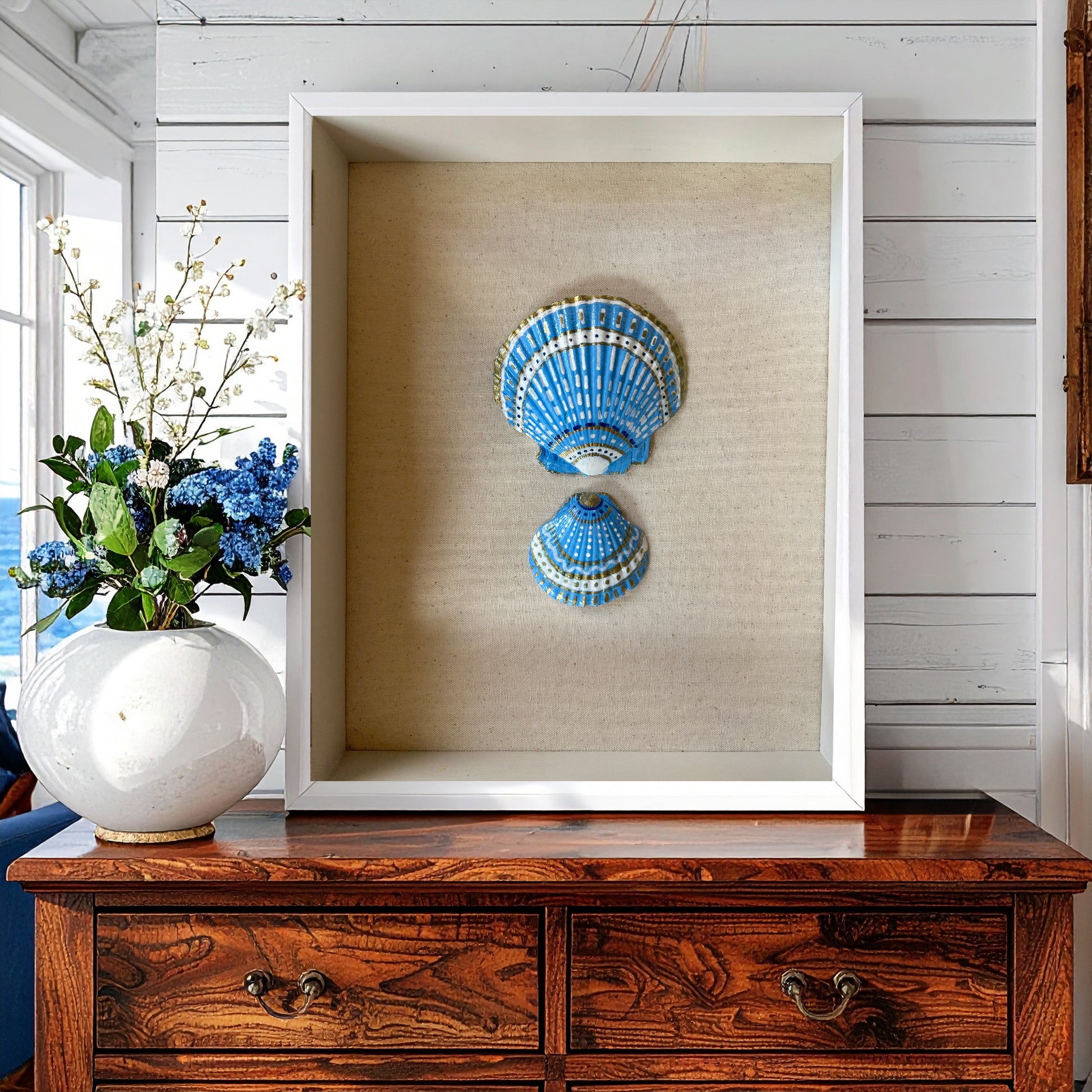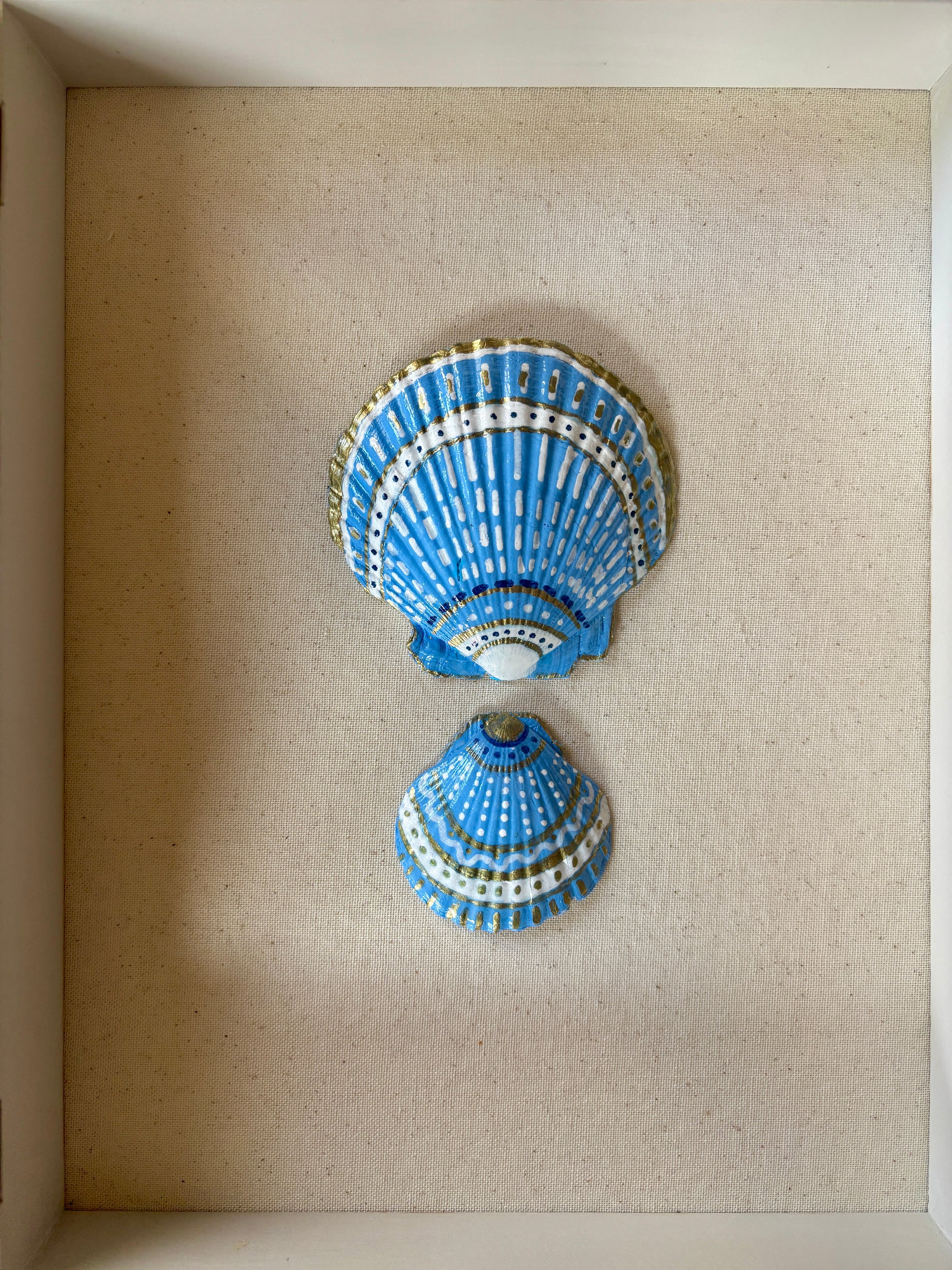 Hand painted selection of assorted light blue, turquoise and white seashells with gold leaf edges, arranged on natural linen canvas. The deep custom frame is made of white solid wood, features a magnetic door and a polished glass window.