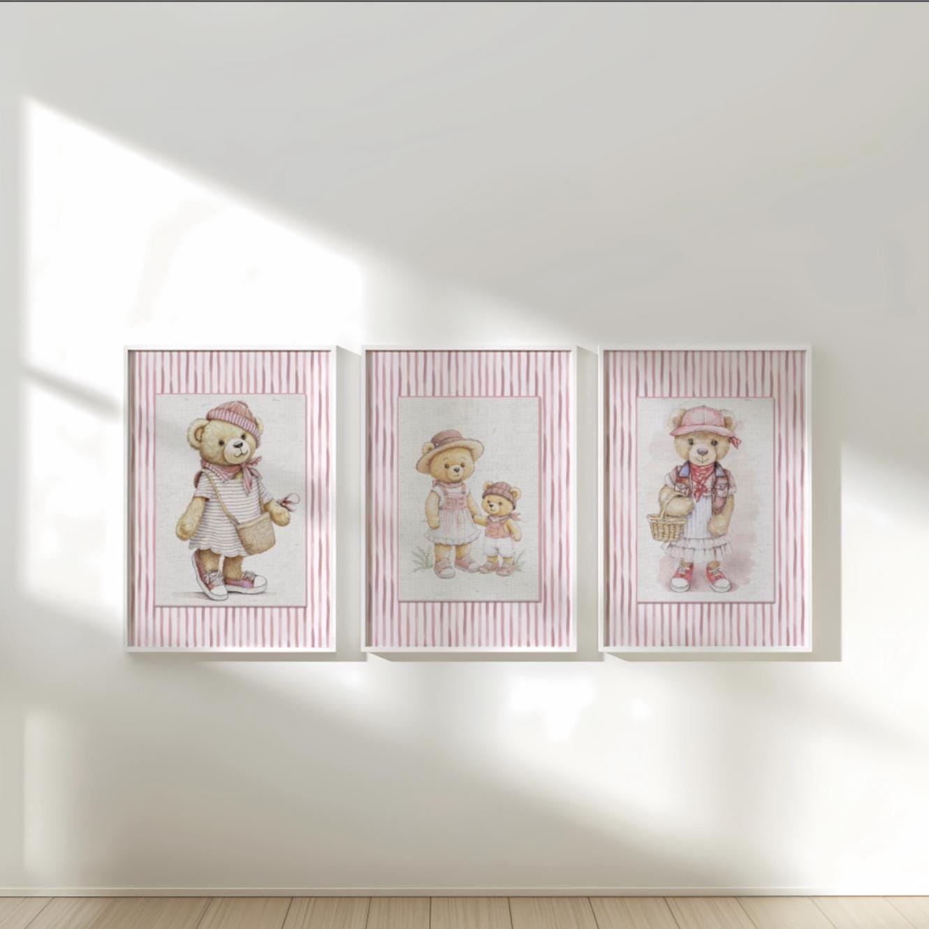 Pink Striped Wall Art Set Of 3 Bear Prints Nursery Room Decor