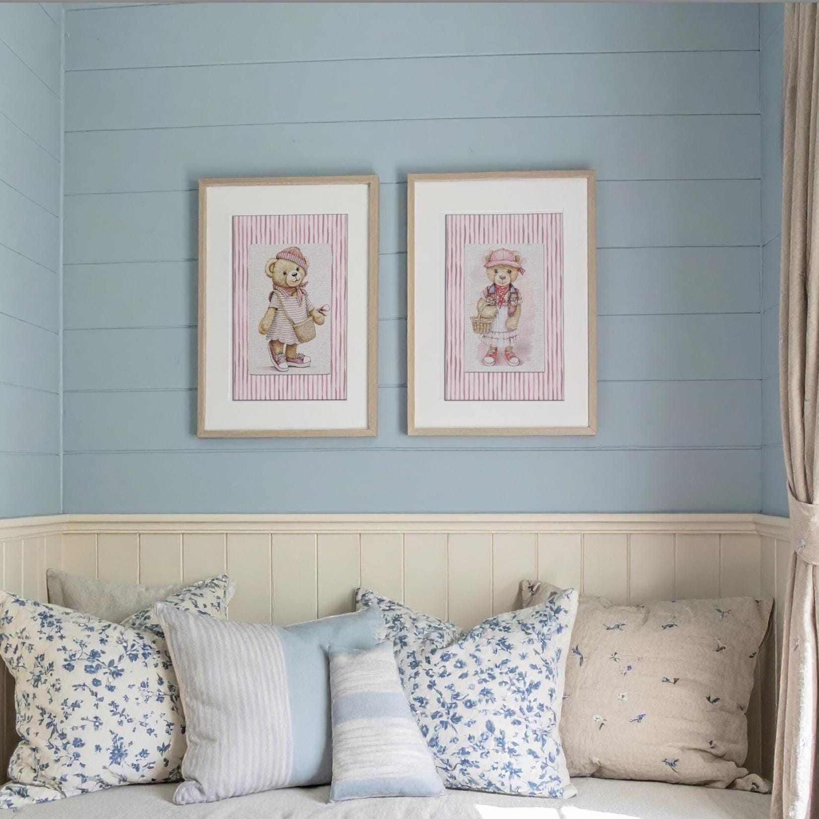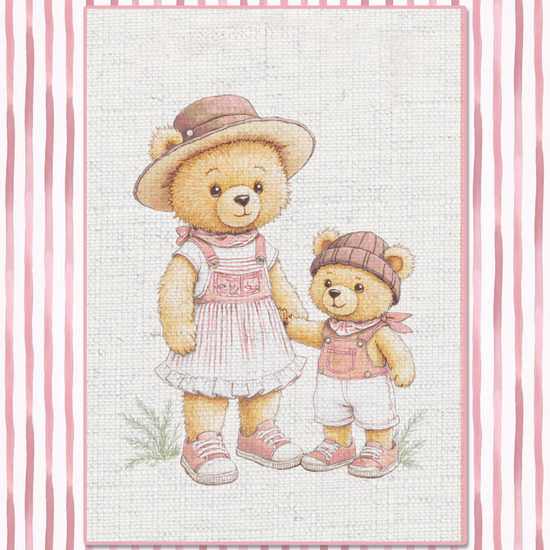 Iconic Bear Girl illustrations finished in a vintage watercolor style, placed on a textile style background and set on an organic pink striped wallpaper. Printed on Hahnemuehle Museum Etching Paper. A perfect addition to your baby girls nursery or children playroom.