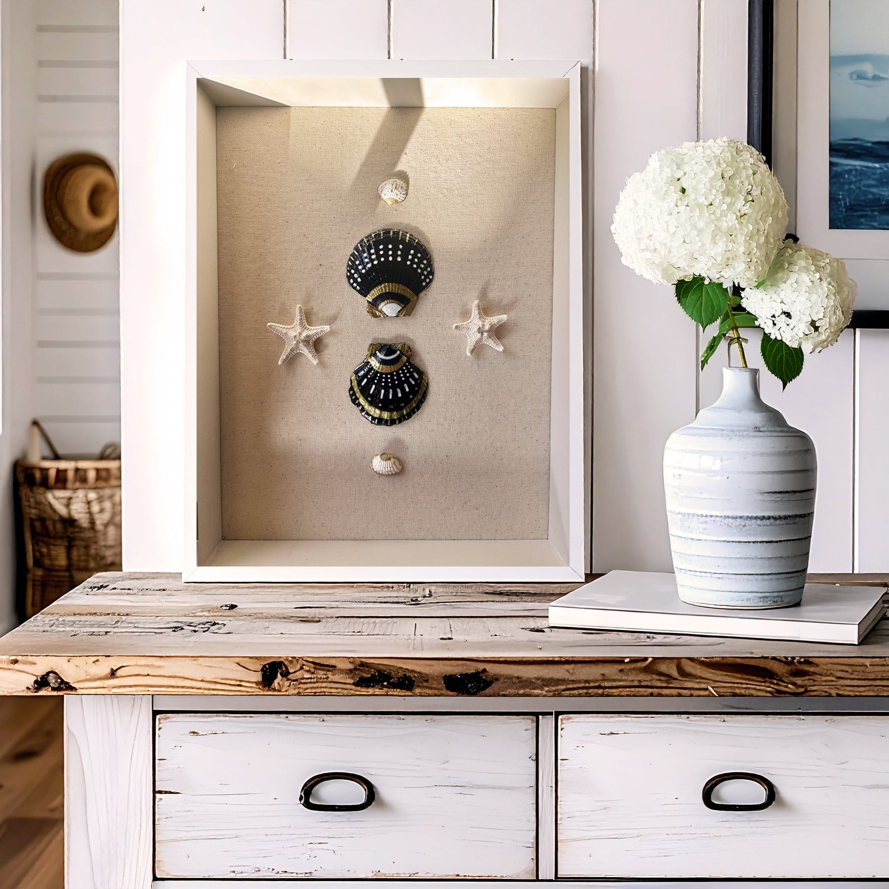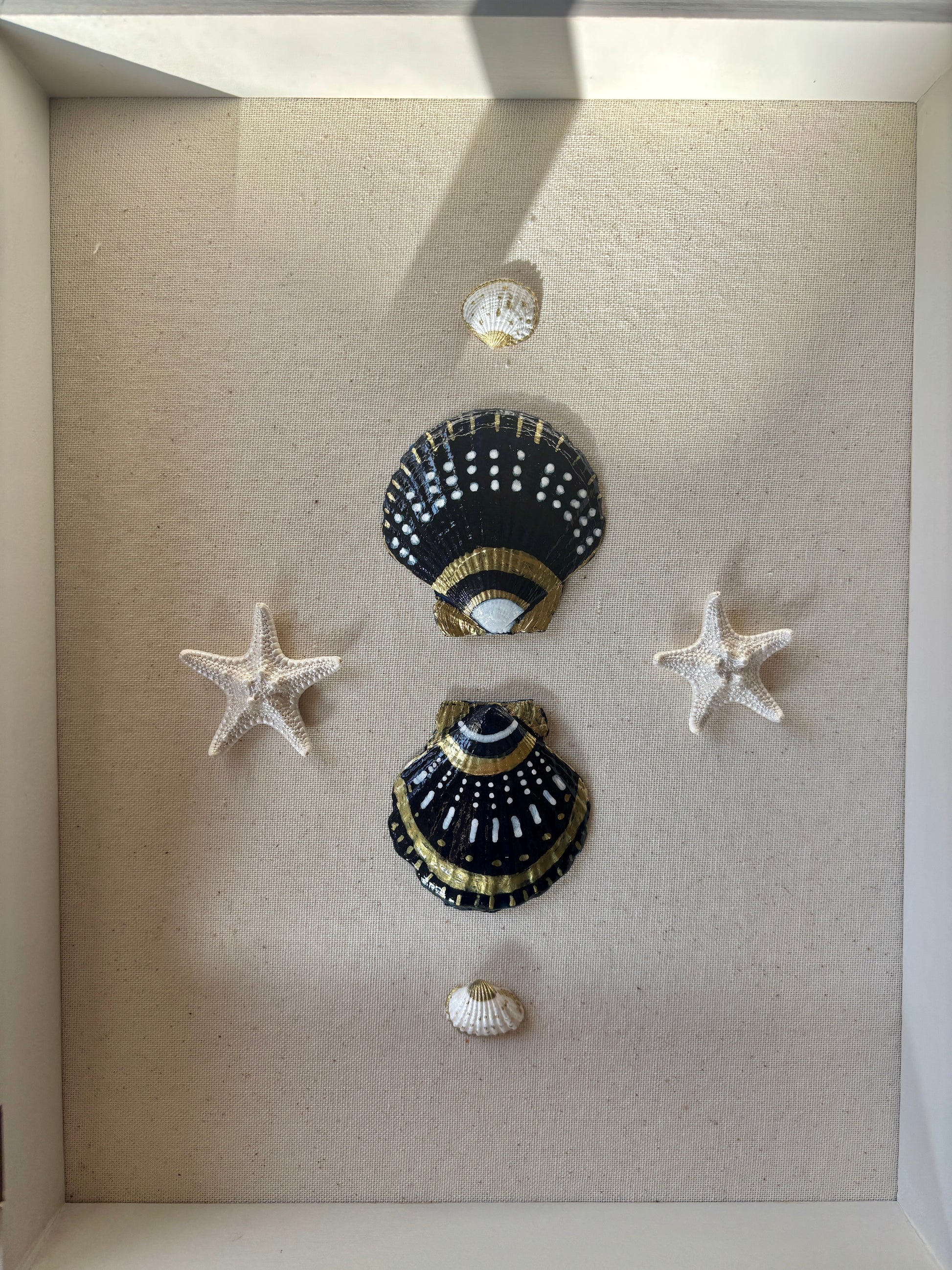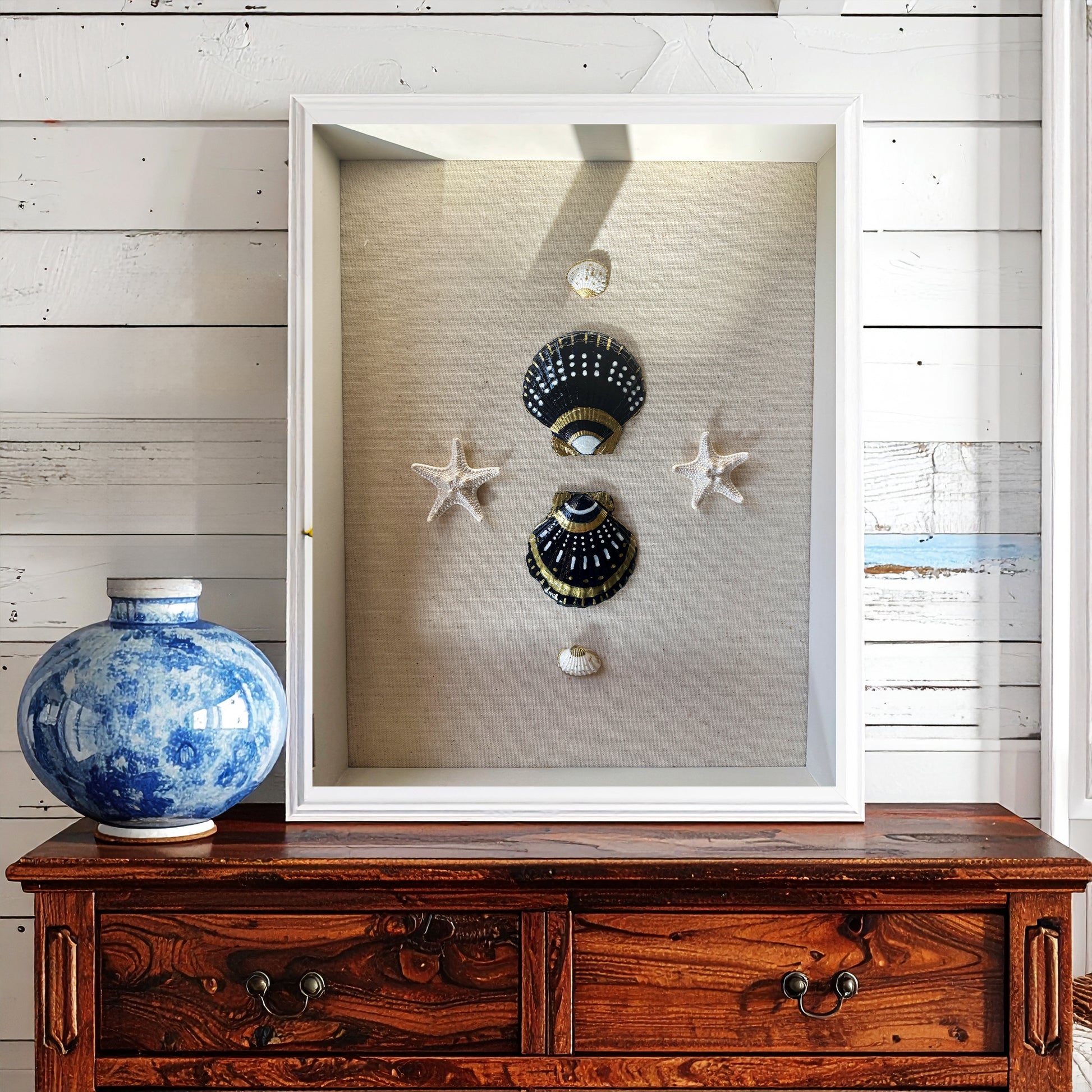 Hand painted selection of assorted navy blue and white seashells with gold leaf edges, arranged on natural linen canvas. The deep custom frame is made of white solid wood, features a magnetic door and a polished glass window.