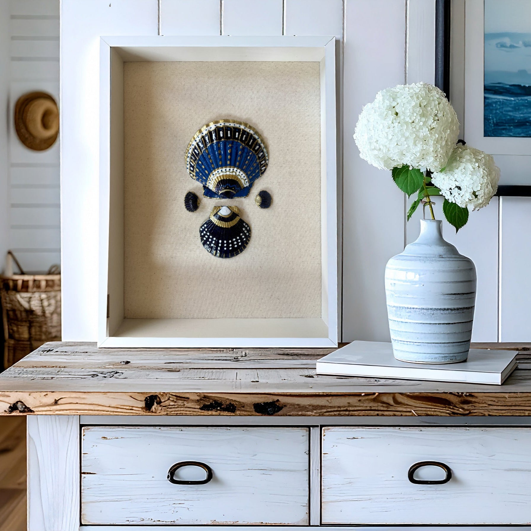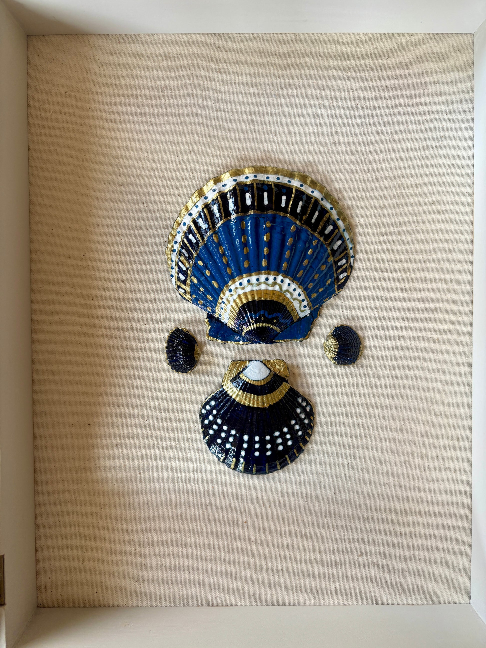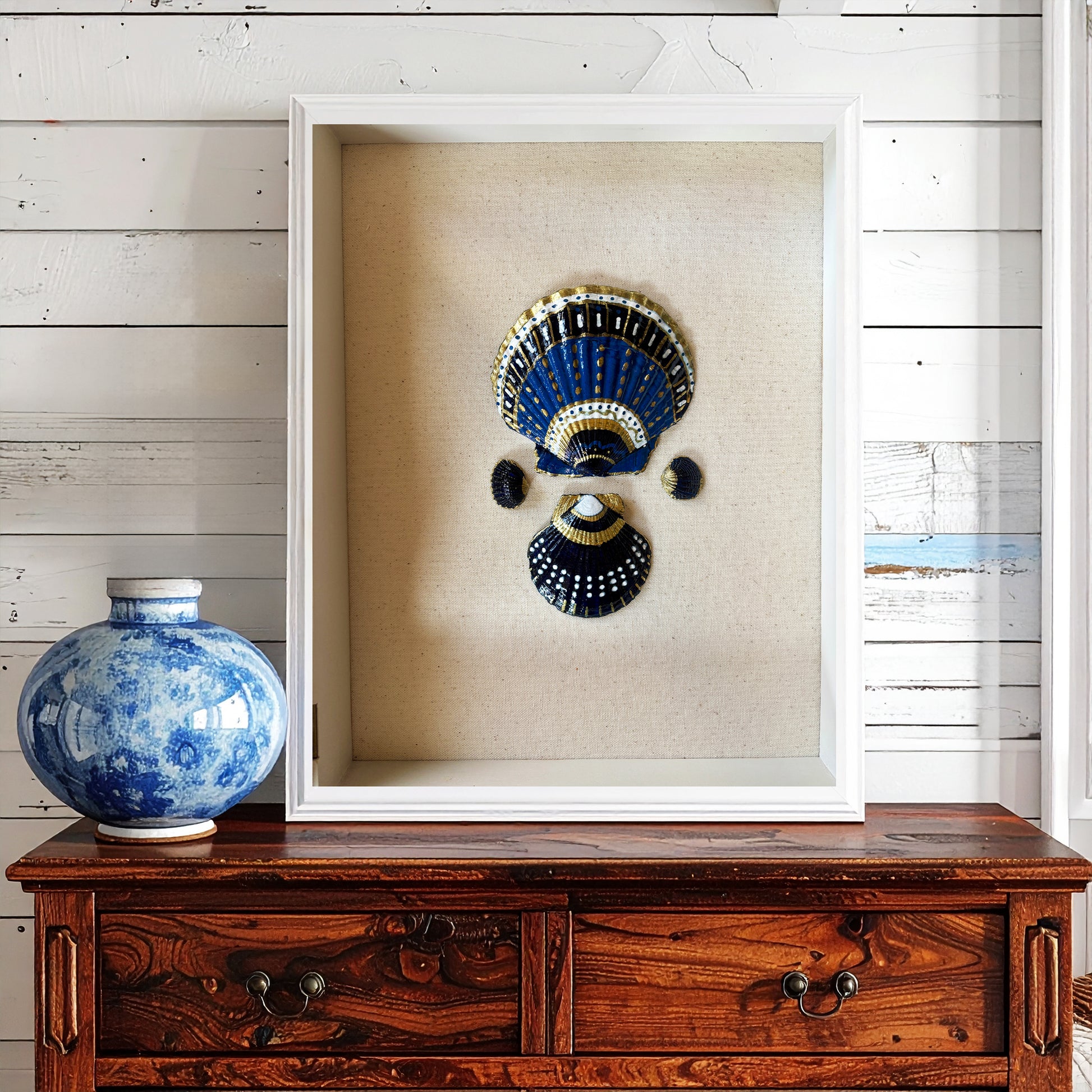Hand painted selection of assorted navy blue and white seashells with gold leaf edges, arranged on natural linen canvas. The deep custom frame is made of white solid wood, features a magnetic door and a polished glass window.