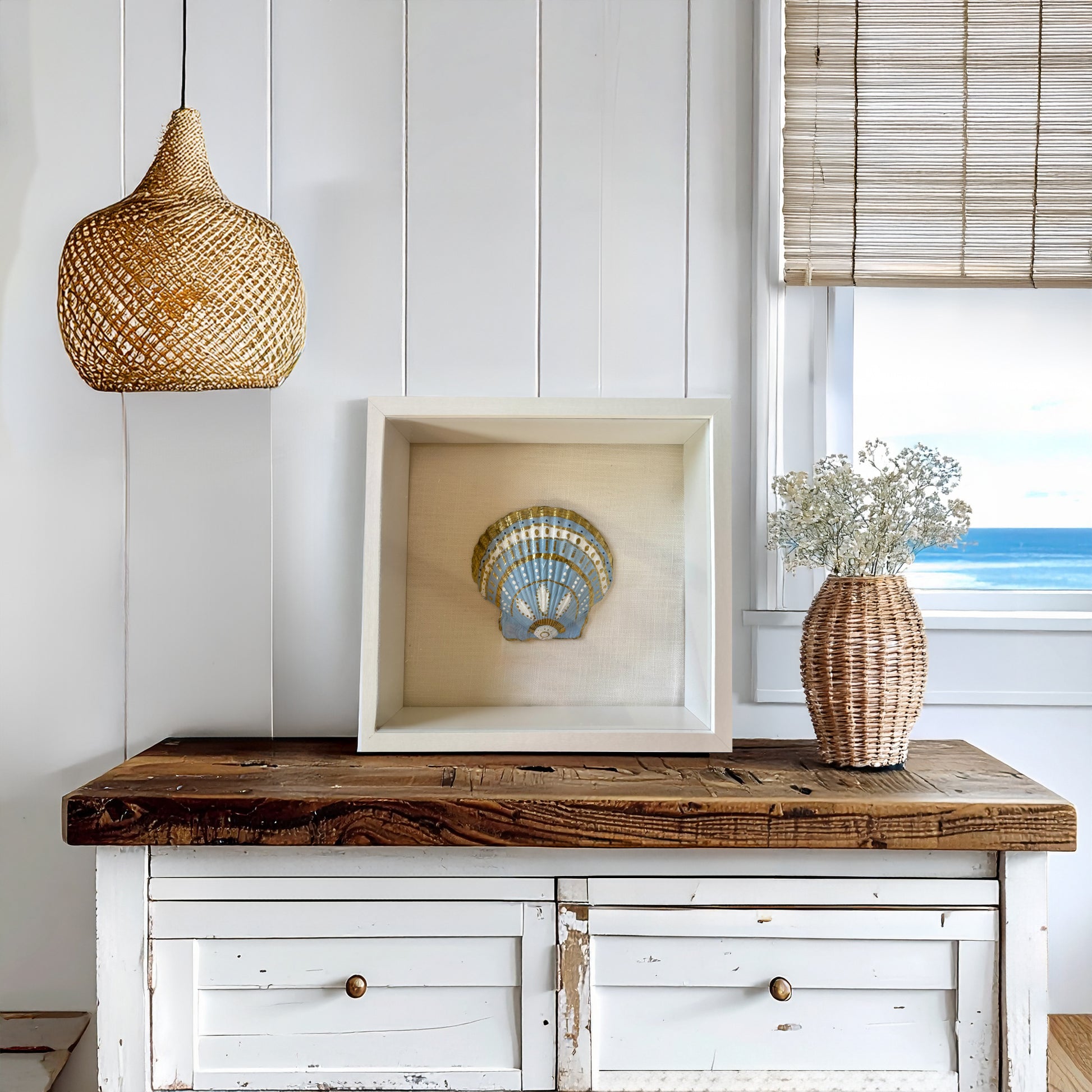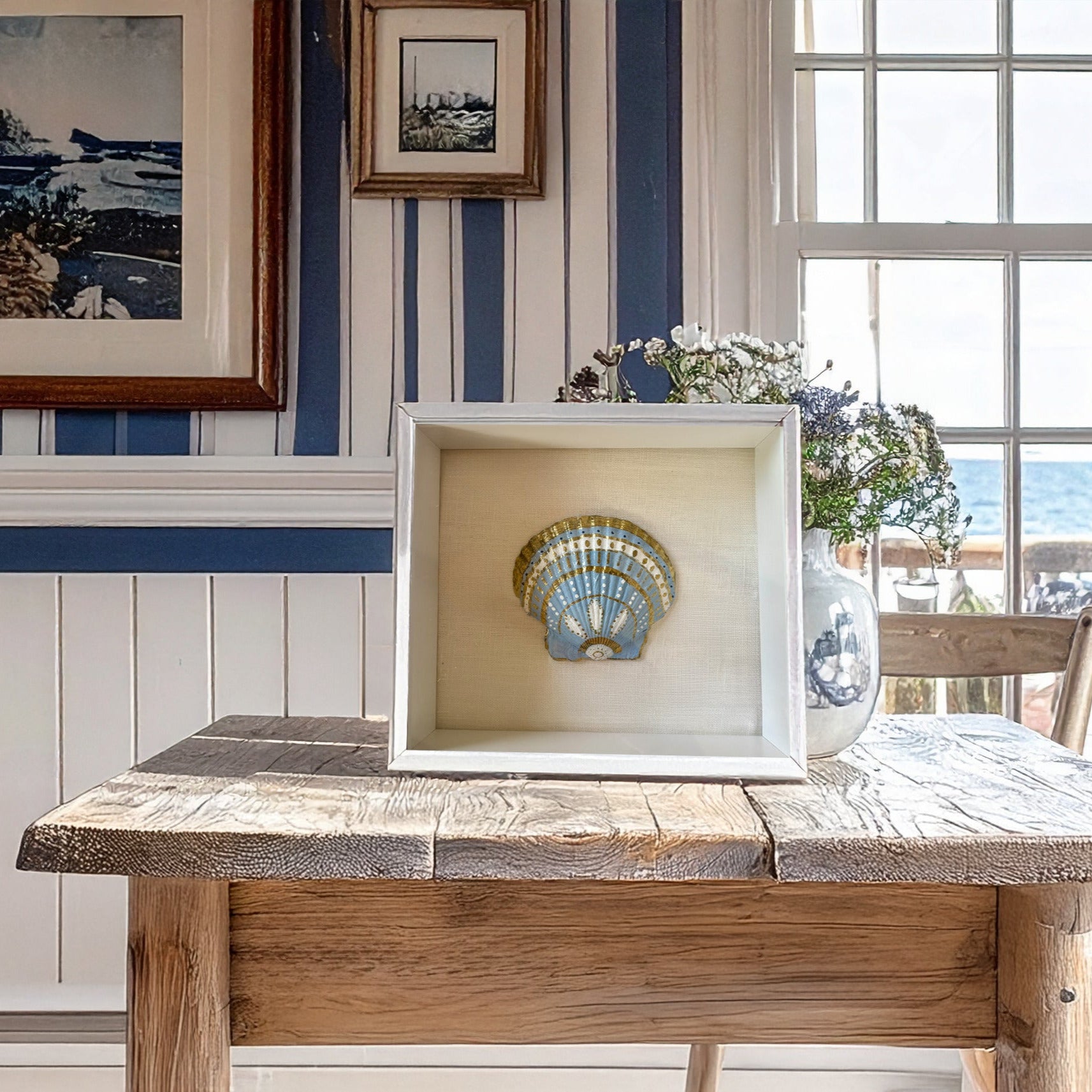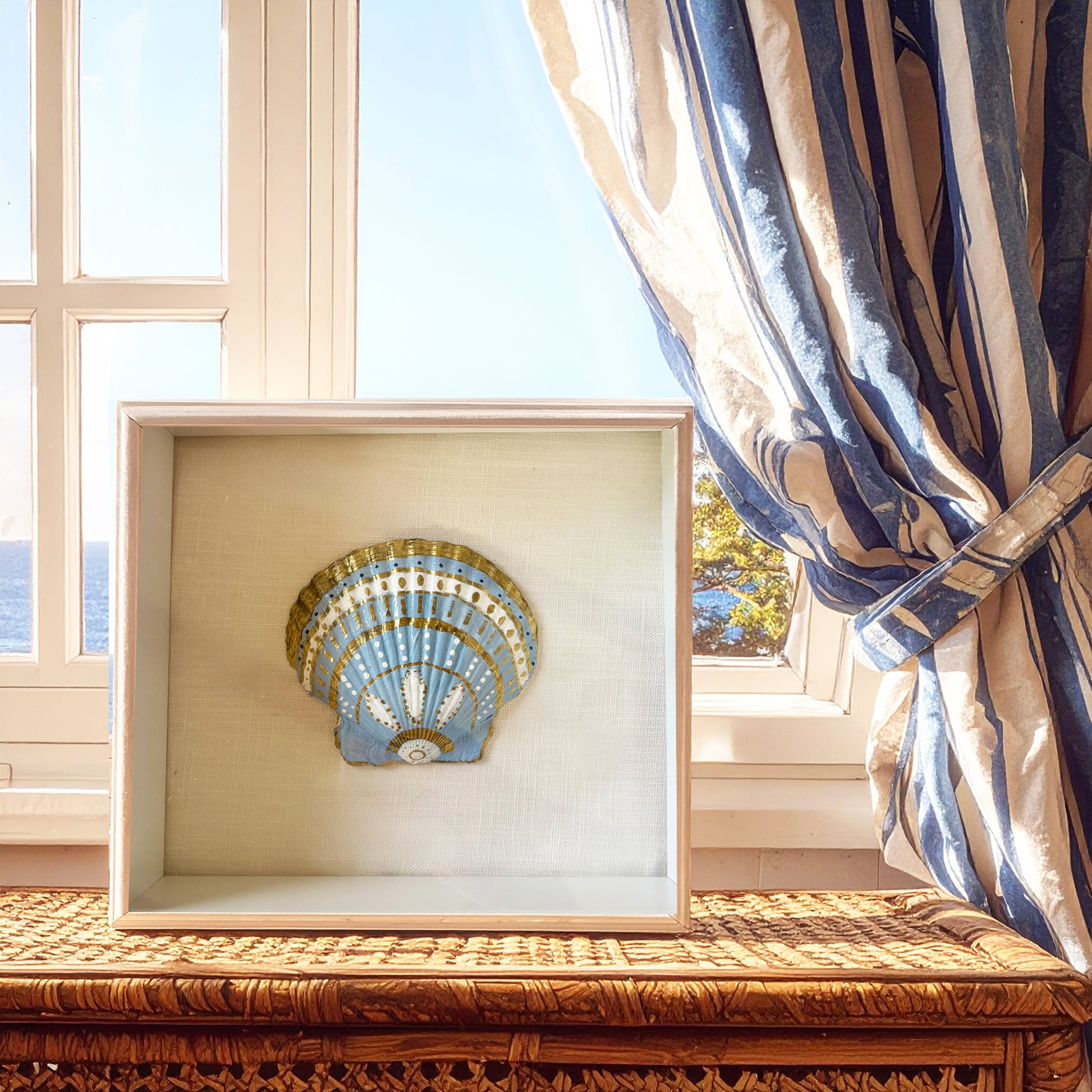 Hand painted scallop seashell in shades of blue and white with gold leaf details and edges, arranged on natural linen canvas. The deep custom frame is made of white solid wood.