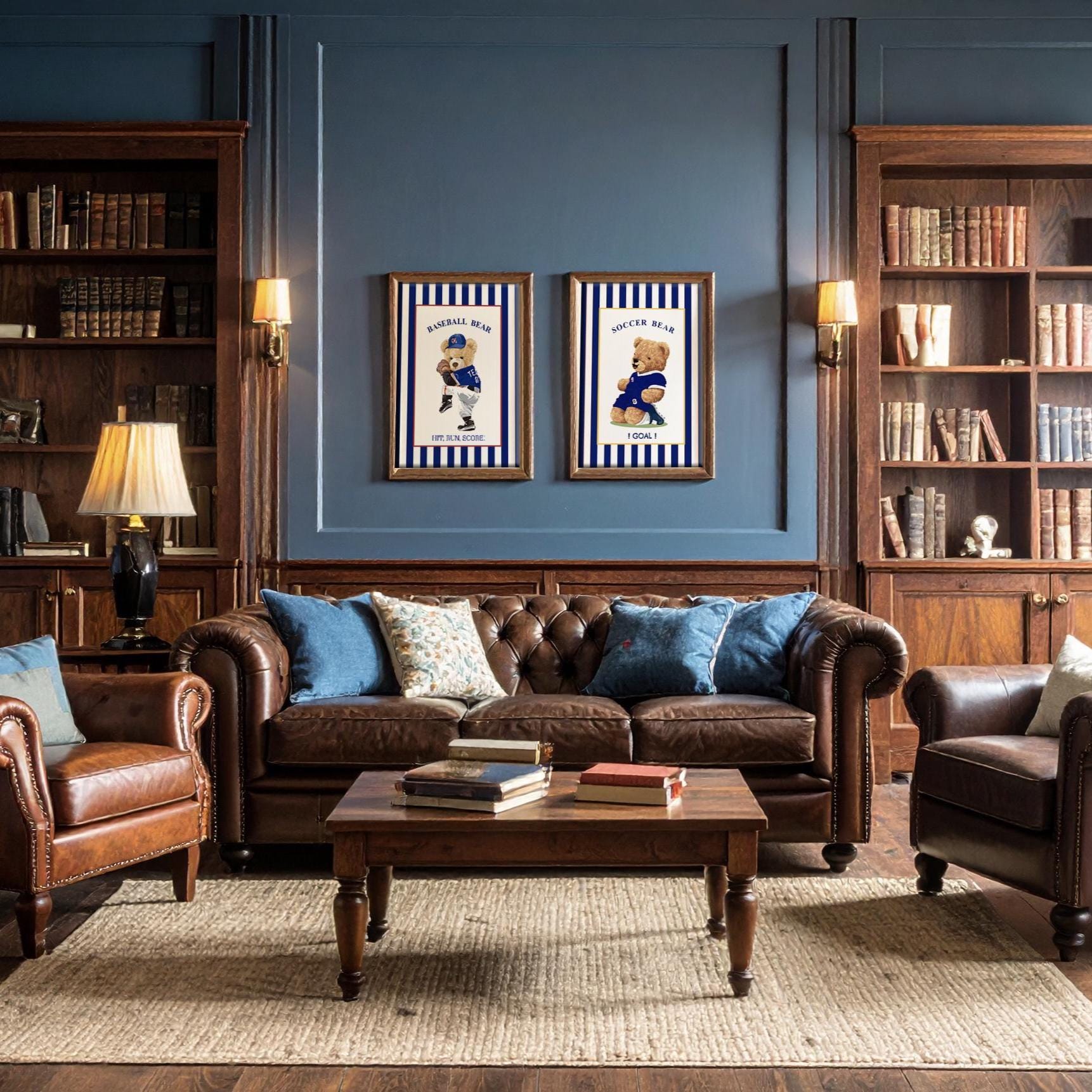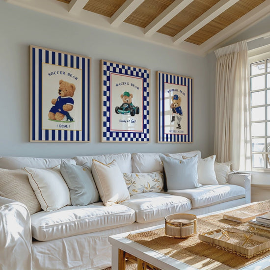 Iconic sport bear illustrations finished in a vintage watercolor style, placed on navy blue and white striped wallpaper. Printed on Hahnemuehle Museum Etching Paper. A perfect addition to your games room, kids bedroom, living room or home office!