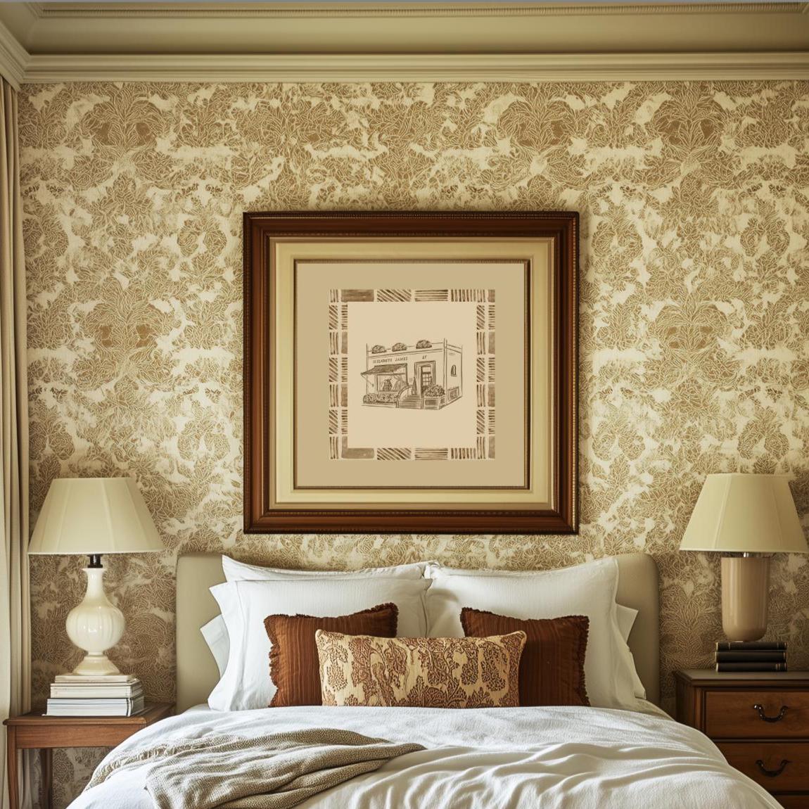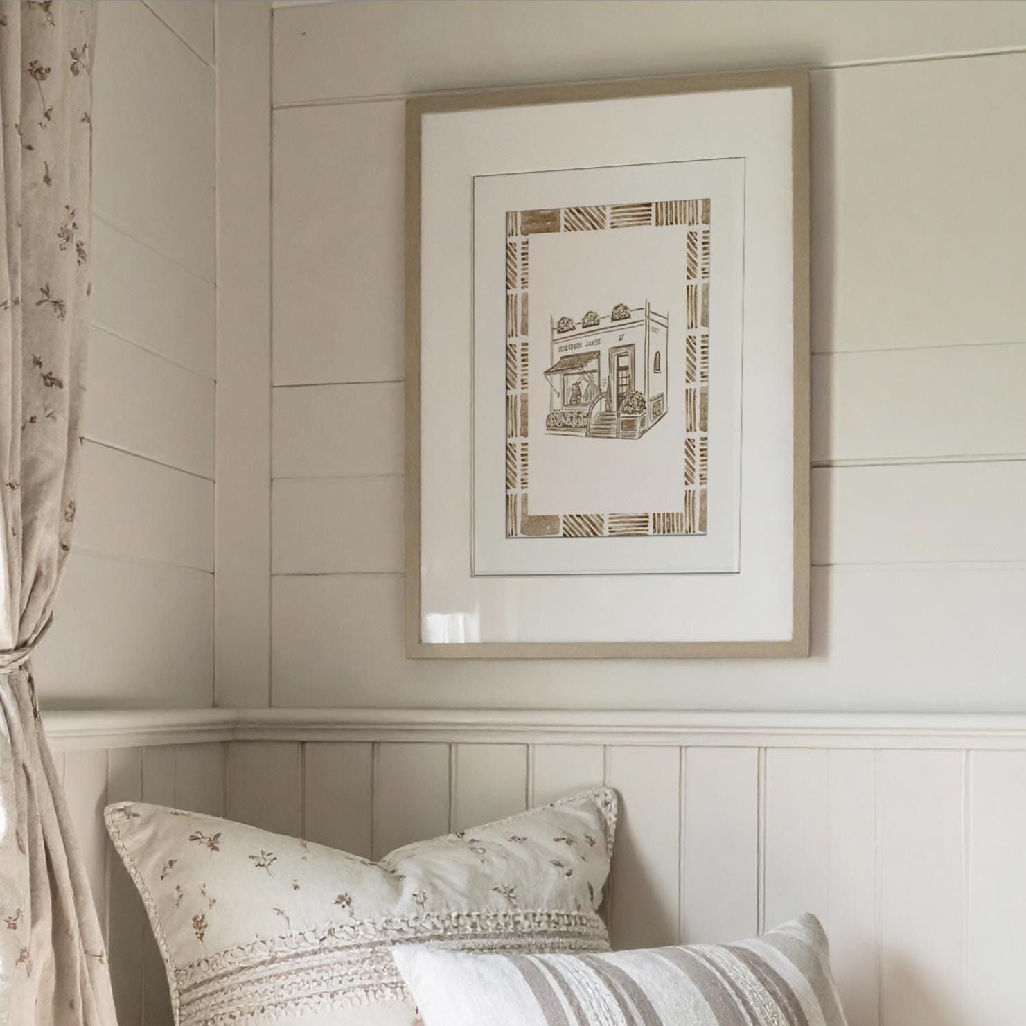 The shop line drawing is placed inside a neutral hand painted print frame and works well in classic and contemporary interiors!