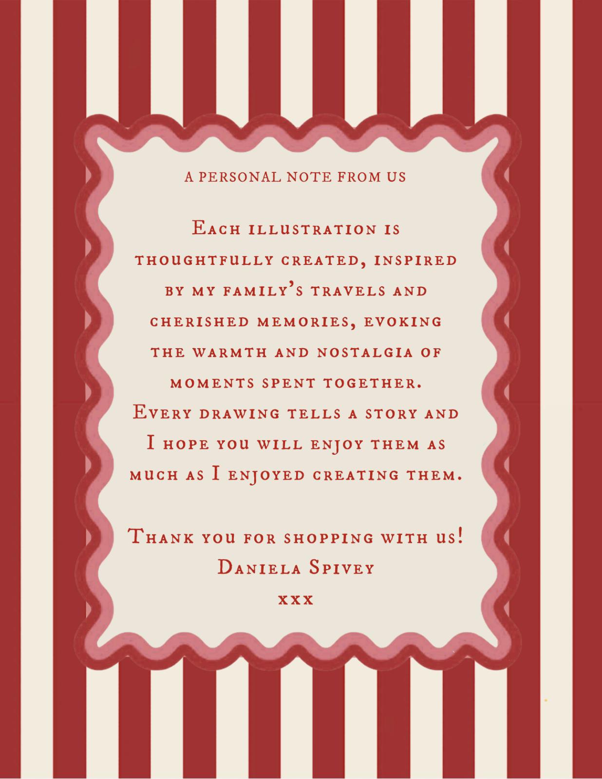 Each illustration is thoughtfully created, inspired by the family's travels and cherished memories, evoking the warmth and nostalgia of moments spent together.