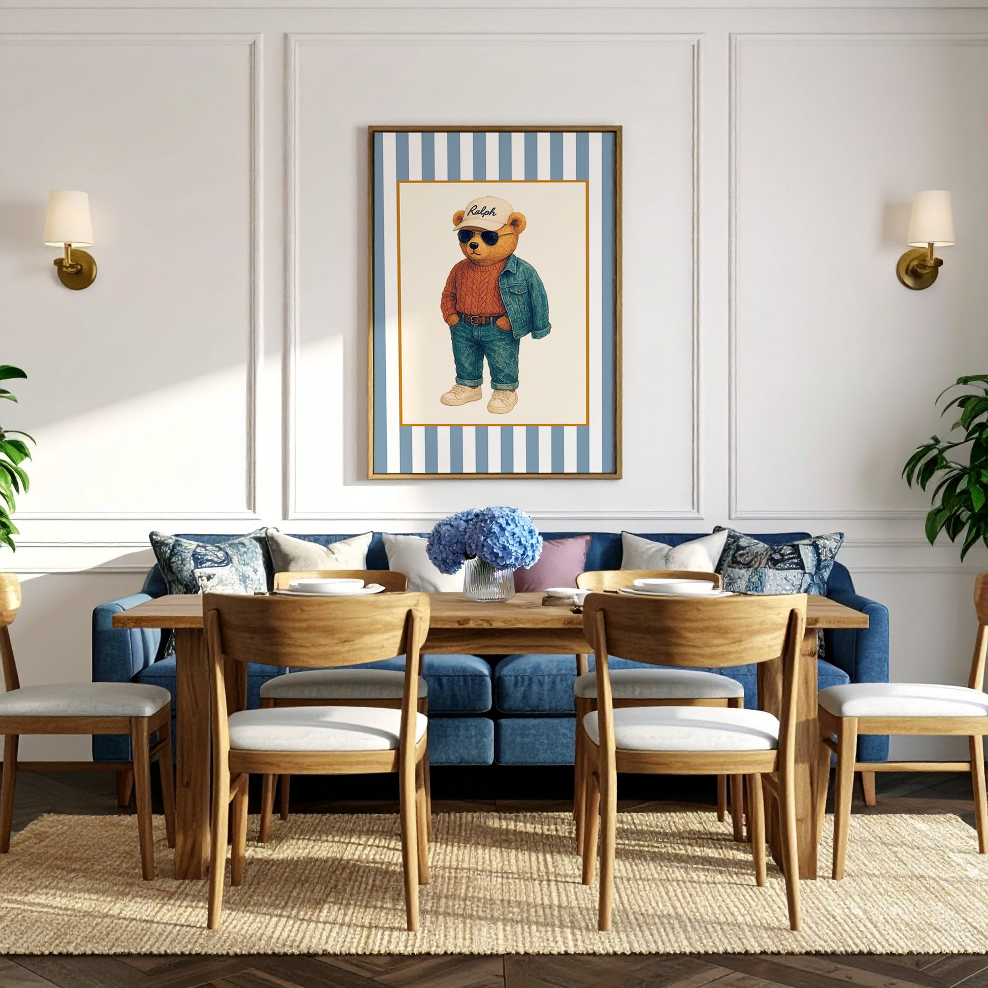 Warm up your home with the charm of this ever popular preppy teddy bear drawing with a light denim blue and white striped background, featuring our favorite bear dressed in cool vintage denims, trendy sneakers and sun faded ball cap.